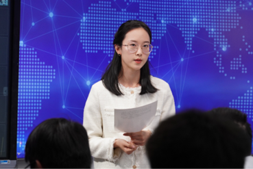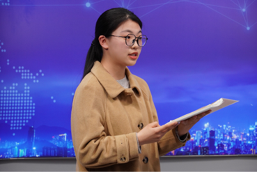音频类获奖代表赵宛钰同学进行发言。她的参赛作品《“榴”光溢彩:返乡老员工为乡村振兴注入新活力》,立足于乡村振兴战略,以采访、画外音、讲解等多种表现形式呈现出深刻的新闻选题。她认为,制作优秀的音频类新闻,需要作者具备躬身实践与现场观察的思维,从而选取具有较高新闻价值的素材。