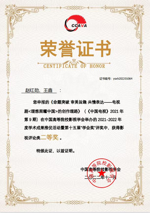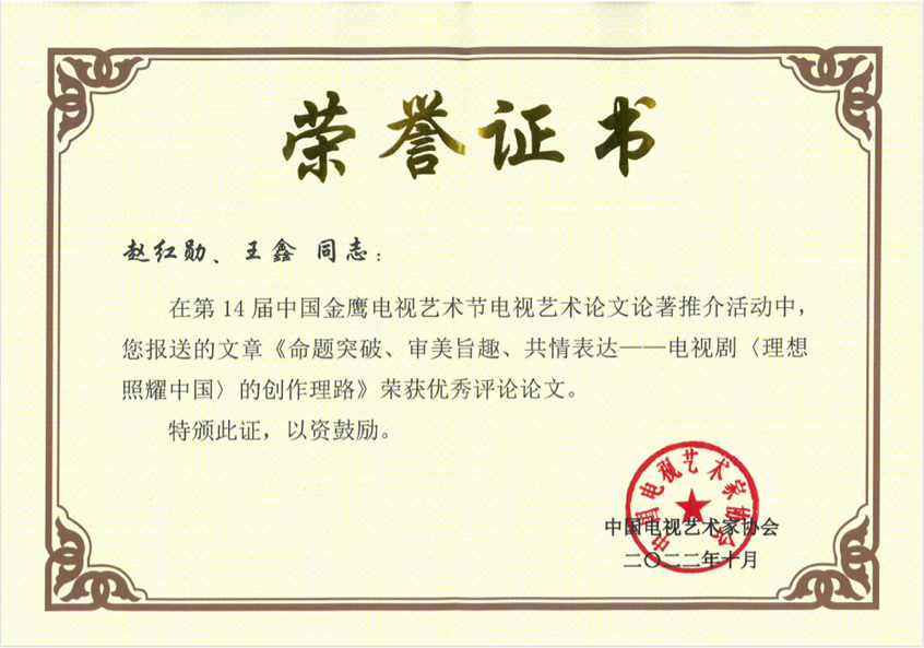 近日,由中国文学艺术界联合会、湖南省人民政府、中国电视艺术家协会主办的第31届中国电视金鹰奖提名荣誉暨第14届中国金鹰电视艺术节优秀论文论著颁授典礼在湖南省长沙市举行。公司赵红勋老师与研究生王鑫共同撰写的学术论文《命题突破 审美旨趣 共情表达——电视剧<理想照耀中国>的创作理路》在近400篇(部)参评作品中脱颖而出,荣获中国金鹰电视艺术节优秀评论类论文奖(不设等次),这是公司师生首次获此殊荣。