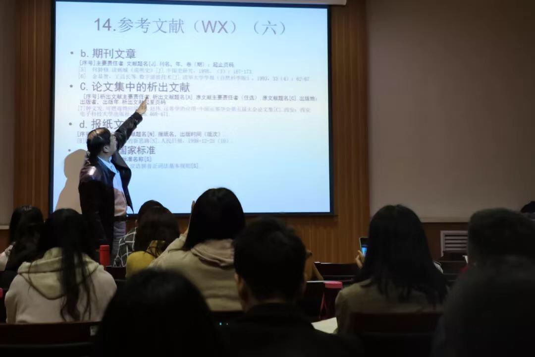 李建伟从论文的题目、结构、摘要、关键词、排序、绪论、注释、参考文献、语言文字、后记等方面向大家讲授了一篇规范的硕士学位论文的写作要求。他分别从学硕和专硕两类学位论文着手,以部分员工的论文为例,分析常见的学术规范问题,与在场的员工进行交流讨论。在解释“注释”和“参考文献”问题时,李建伟采用对比的方式,清晰地表明了二者各自的特点和要求。同时通过展示毕业生论文,李建伟指出了论文中常见的语法和文字错误,提醒员工在写作论文时,要秉持严谨的态度,必须经过多次校对,降低错误率。李建伟还认真地说:“在论文的写作过程中,语言文字是最基础的,也是不可忽视的。对于语言文字的使用,要准确、流畅、优美,即信、达、雅。”