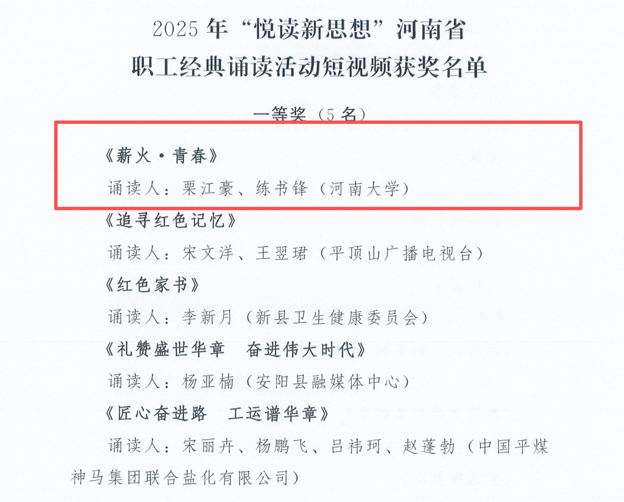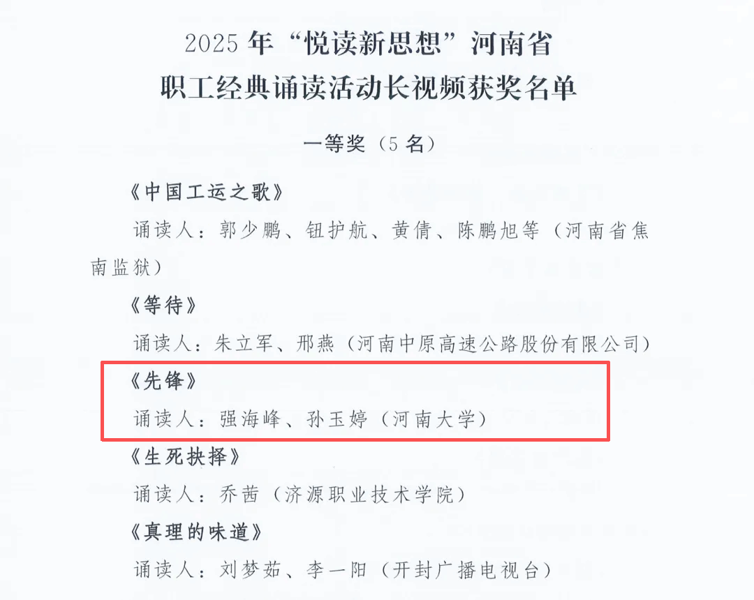 近日,2025年“悦读新思想”河南省职工经典诵读活动评选结果揭晓。本次活动由省委宣传部、省总工会联合主办,旨在通过经典诵读的形式,在全省职工中深化党的创新理论学习,展现新时代职工的精神风貌和文化自信。