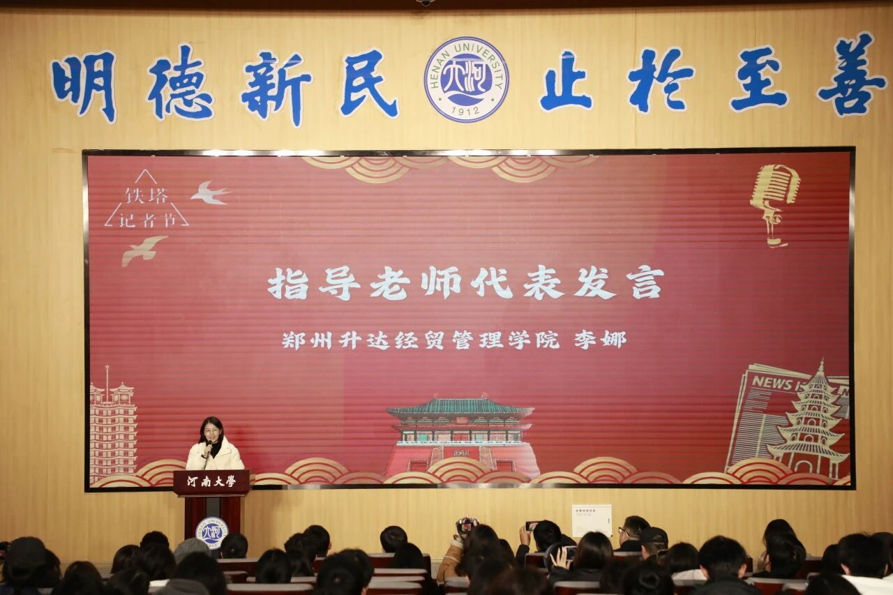 郑州升达经贸管理公司李娜老师作为指导教师代表,分享了亲身指导员工的感悟。她以“铁肩担道义,妙手著文章”与在场师生共勉,强调新闻不仅要传递信息,更要关注普通人的境遇,鼓励同学们持续保持创作热情,成长为有温度、有担当的新闻人。