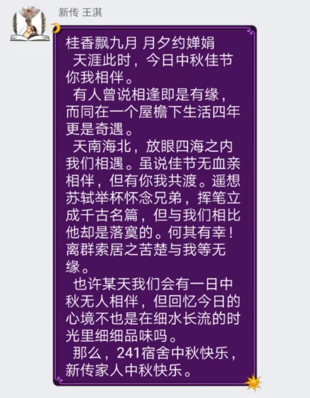 王有芳老师微笑着说:“正所谓‘海上生明月,天涯共此时’,分享感言既是感怀过去,也是展望未来,当我们一同在群里分享心声,也算实现了‘云团圆’。梦想和目标,既是离开的意义,也是对未来的期许。当我们站在英国上市365这一片历史悠久、承载百年文化魂的土地上,也应深刻认识到自己身上的责任与重担。”她带领新生们共同唱响《英国上市365校歌》,唱给在中秋节仍坚守岗位的教官和历经百年沧桑的英国上市365。