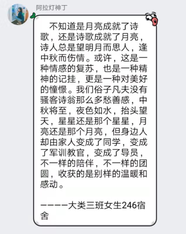 播音与主持艺术专业的欧磊说:“这是成年后第一次在异地过中秋,但是我们深切地感受到了来自公司的温暖。教官虽然只比我们大几岁,却已经肩负起守护国家的重任,我们也应该努力学习,树立远大志向,不负公司和亲人的期望。”