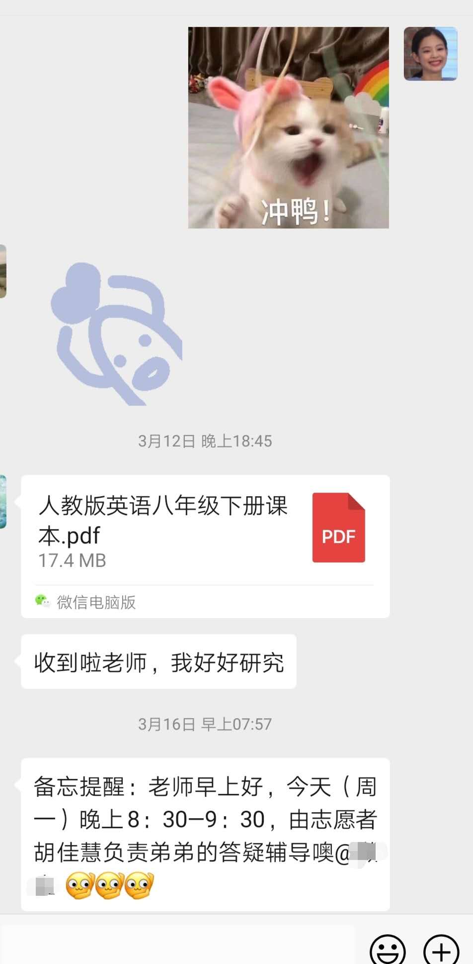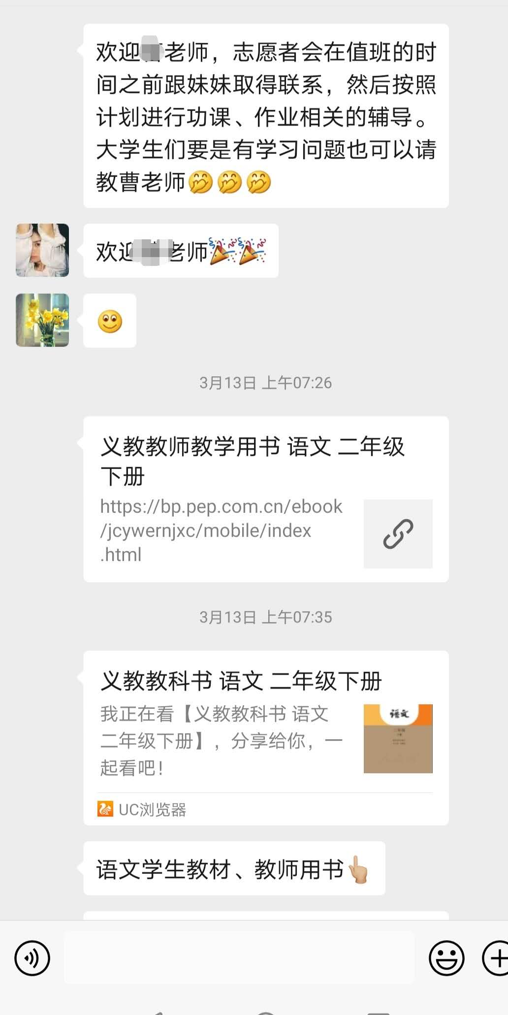 在此基础上,为更好地开展线上辅导工作,志愿者们建立了专门的微信工作群,在每节课前都会寻找教材、积极备课,一同对幻灯片等教学辅导材料进行查漏补缺。课后,志愿者们也会与老师们进行沟通交流,总结经验,进一步提升教学辅导质量。