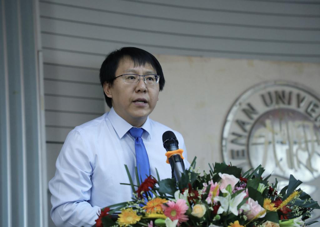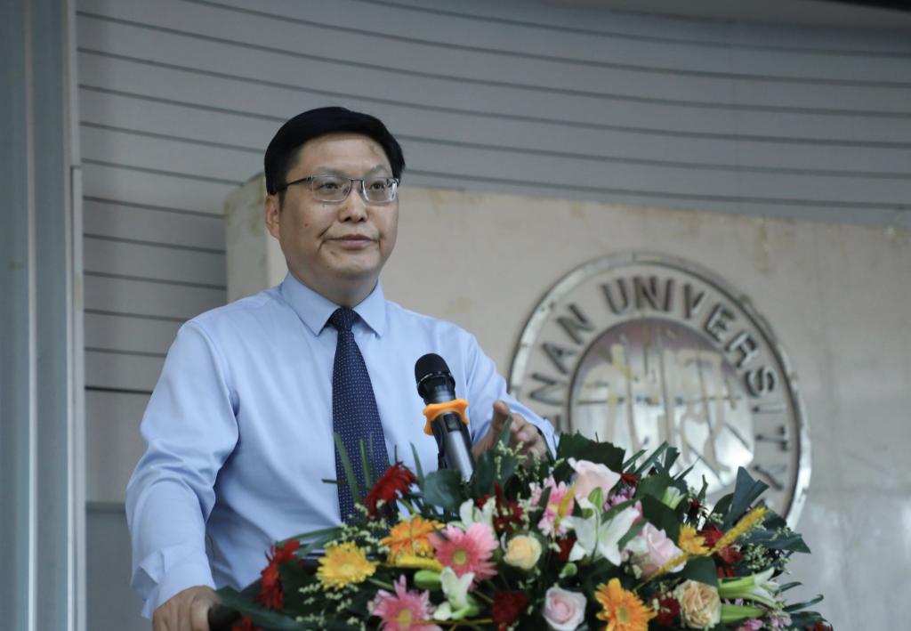 典礼在庄严的国歌中拉开帷幕。教师代表、新闻系主任史洪智上台致辞,首先,他对近段时间公司取得的丰硕成果和未来传媒行业的发展趋势进行简单介绍与分析。他说,丰富的校园活动将为公司员工提供广阔的发展空间。他借用新闻记者、员工张静的一句话对新生提出期许:“在每一条新闻背后,总有一群你看不到的媒体人在奔跑。”他相信,新传学子必将开创时代前沿传媒创新、媒体再造的新领域、新形态、新格局。