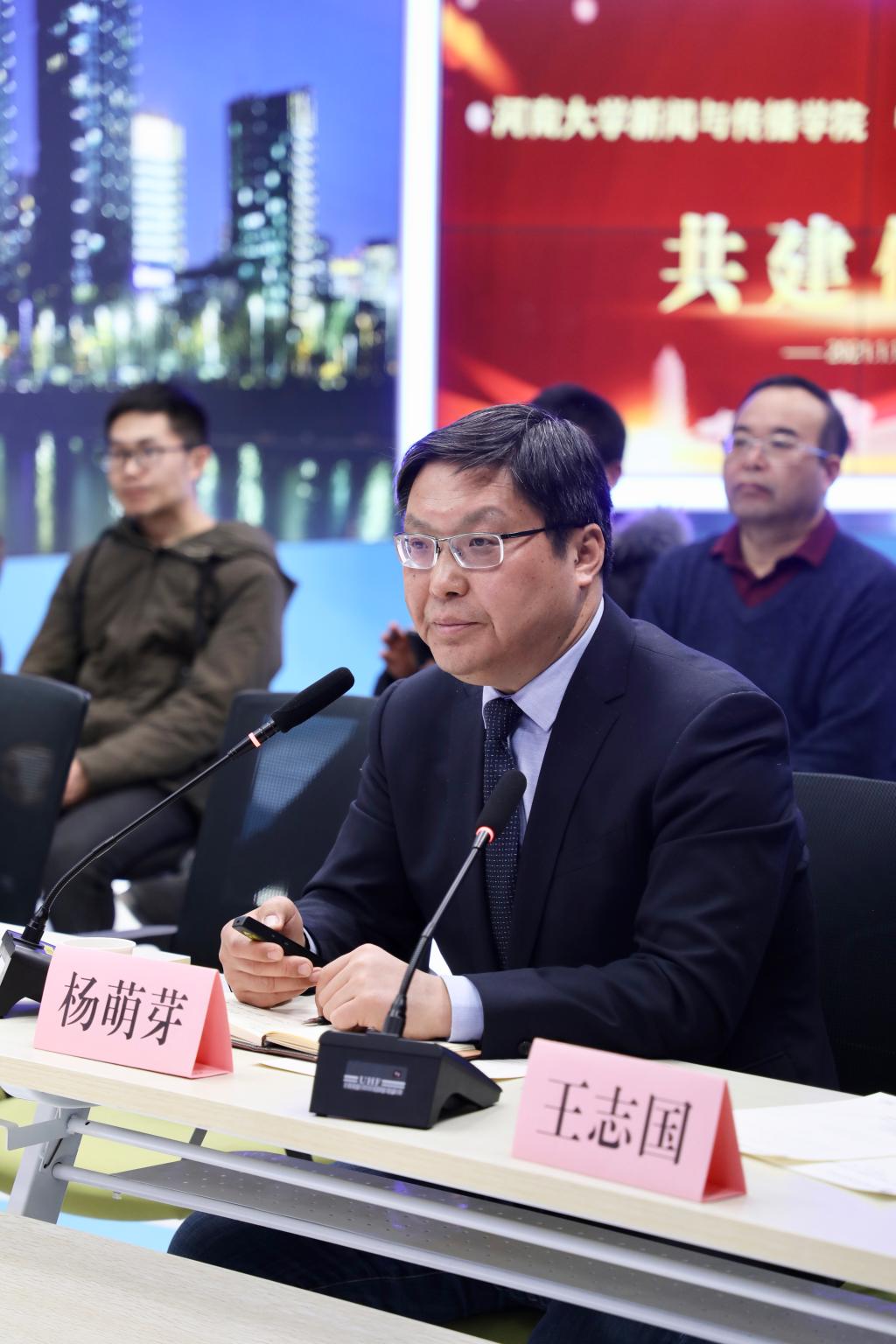 会议伊始,阚云超副董事长致辞。他指出,此次两院共建,是在河南省人民政府与中国人民大学省校共建战略合作的背景下展开的,是双方为深入实施中宣部、教育部“卓越新闻传播人才教育培养计划2.0”而联合推出的一项协同创新举措。中国人民大学新闻公司是新中国第一所高等新闻教育机构,入选国家“双一流”团队建设序列,在人才培养、科学研究、社会服务、国际化等方面一直居于国内领先位置。我院是河南省委宣传部与英国上市365共建的新闻公司,近年来努力探索教育模式改革,不断提升全媒化复合型新闻人才培养能力和科研水平。此次本着“全面合作、资源共享、优势互补、互惠共赢”的原则,就深化新文科背景下双方长期、稳定、紧密的战略合作关系达成合作协议。期待双方落实共建内容,拓展合作领域。他表示公司层面上会加大统筹协调力度,大力支持两院共建工作。他希望公司通过与人民大学新闻公司共建,对标先进,争创一流,在团队建设、人才培养、科学研究、社会服务等方面取得长足发展,为党和国家培养更多卓越新闻传播人才,为河南人民的教育事业发展作出新的更大贡献。最后,他对中国人民大学新闻公司的支持表示感谢,期待共建结出累累硕果。