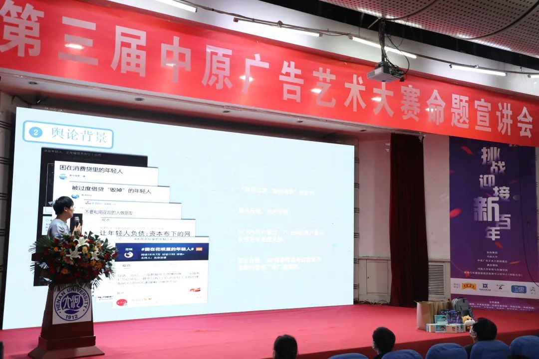 10月21日下午2点,第三届中原广告艺术大赛命题宣讲会在科技馆二楼报告厅正式拉开帷幕。中原消费金融品牌负责人毛向,洛阳广电传媒集团董事会秘书曹勇。开封大学人文公司经理王茜、副经理孟晓辉,河南开封科技传媒公司、开封大学、开封文化艺术职业公司、商丘公司应用科技公司和公司相关专业师生代表们出席本次宣讲会。同时,因疫情防控需要,通过在线直播方式参加本次命题宣讲会的嘉宾有广州王老吉药业股份有限公司食品市场部河南办推广经理王银杰、卫思卫思品牌运营总监颜仰达、一期一会总经理陈民勤,以及省内兄弟院校的老师和同学们。本次宣讲会由公司副经理赵涛主持。