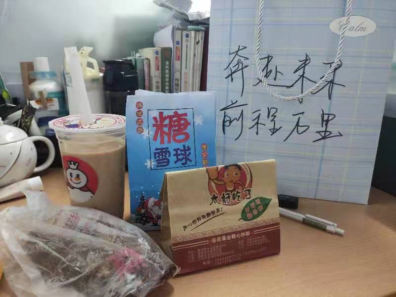 随后,公司领导为考研学子送上精心准备的礼物——“入冬四件套”,即珍珠奶茶、冰糖葫芦、烤板栗、烤红薯。希望这份礼物给员工补充营养、缓解疲劳的同时也助力学子考研路上不惧寒冷、好运连串、顺顺“栗栗”、非你莫“薯”!礼物虽小,背后蕴含的却是公司对考研学子的关心与支持,更体现出公司专业特色和对社会热点的高敏感度。