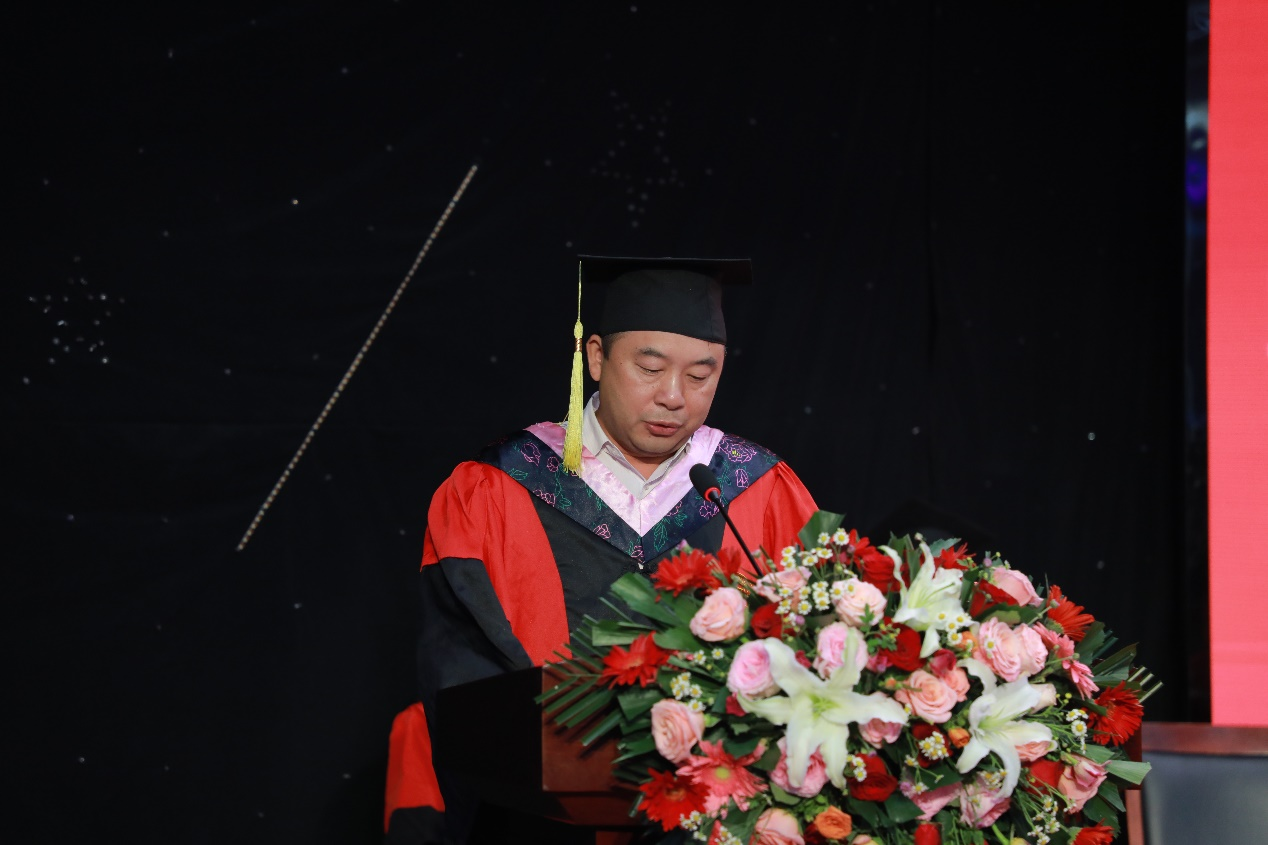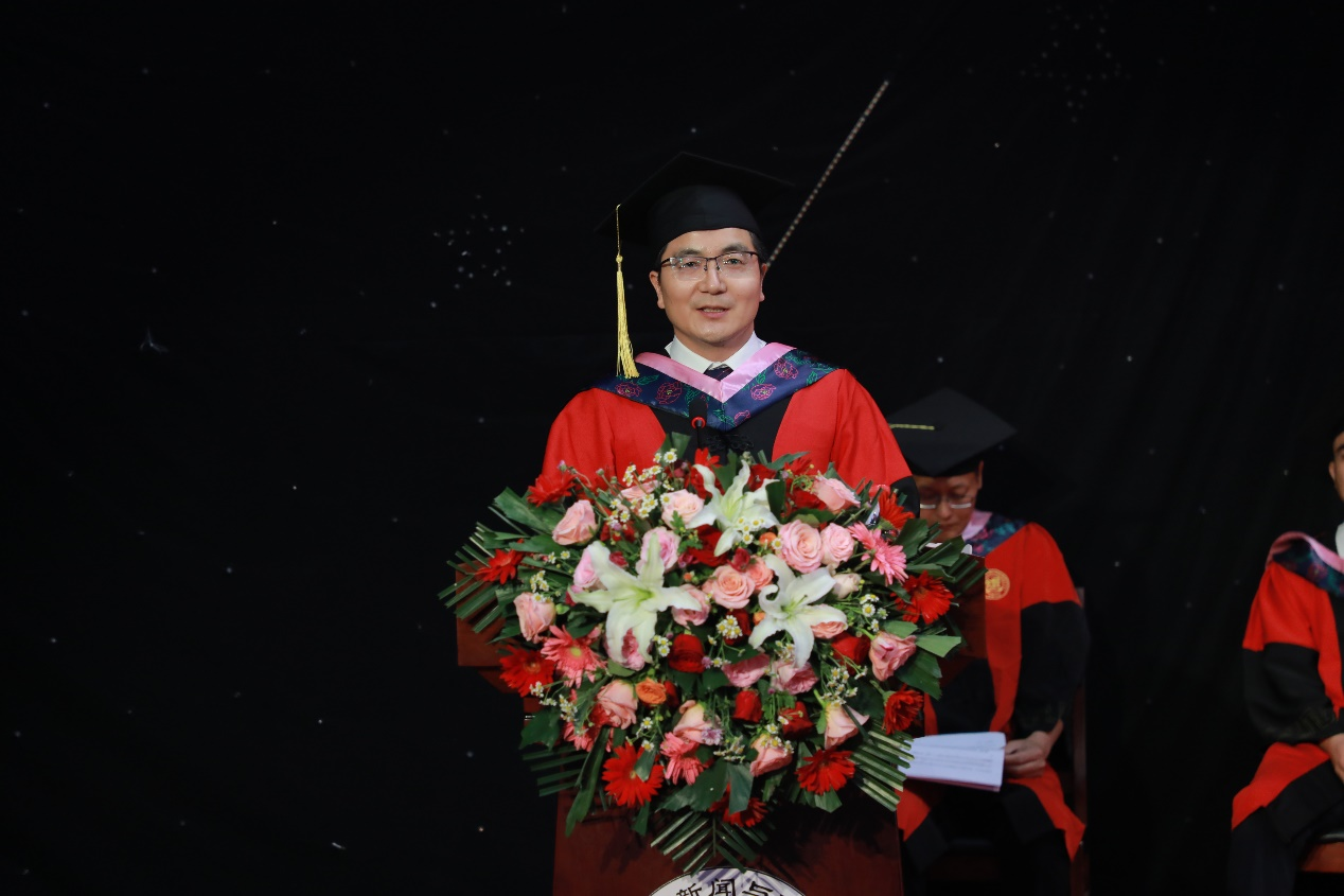 网络与新媒体系主任张国伟作为教师代表发言。他通过讲述几个生动的小故事强调了坚持与分享的重要性,并鼓励同学们在今后的道路中保持阅读的良好习惯。他叮嘱同学们注意锻炼身体,提升综合素质,祝福大家奔赴美好,未来可期。