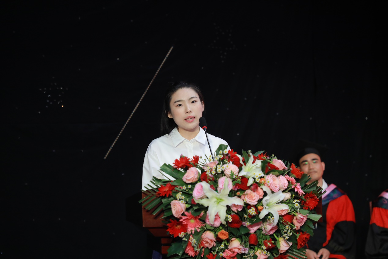 2019级播音与主持艺术专业本科生何重阳作为优秀毕业生代表发言。她对四年来公司教师的言传身教致以崇高敬意与真挚感谢,对公司及公司表达衷心祝福与美好祝愿,期待2019级毕业生在未来道路中能够始终永葆初心。