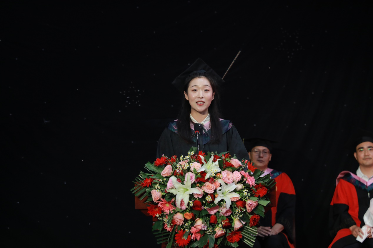 2020级新闻学专业本科生姚文菲作为在校生代表发言。姚文菲对学长学姐表达了最真挚的祝贺与祝福。学长学姐身上具备的秉节持重、博学多闻、锐意进取等品质精神是照亮学弟学妹奋力前行的灯塔。姚文菲祝愿学长学姐们用热情和智慧续写新的辉煌篇章。
