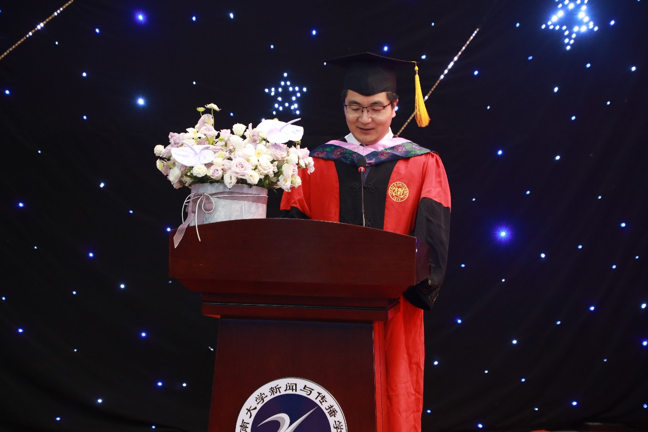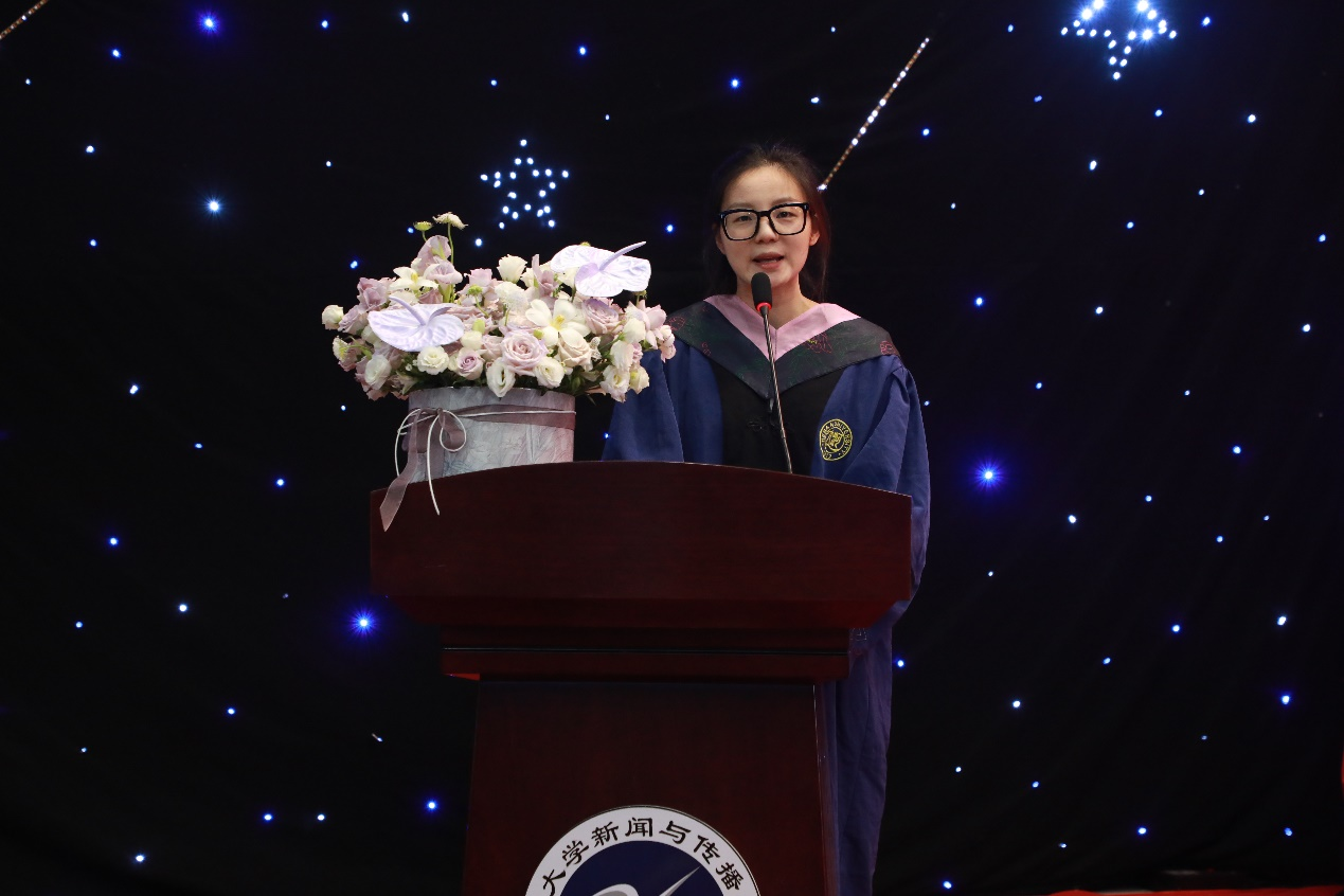 2021级广播电视专业硕士研究生张毅作为在校生代表发言,她表示,学长学姐们身上体现出的勤奋刻苦的学习精神、锐意进取的拼搏精神是她成长过程中的宝贵财富。同时,她祝福学长学姐们在星辰大海中追寻心中所爱,在广袤河山间承担社会责任。