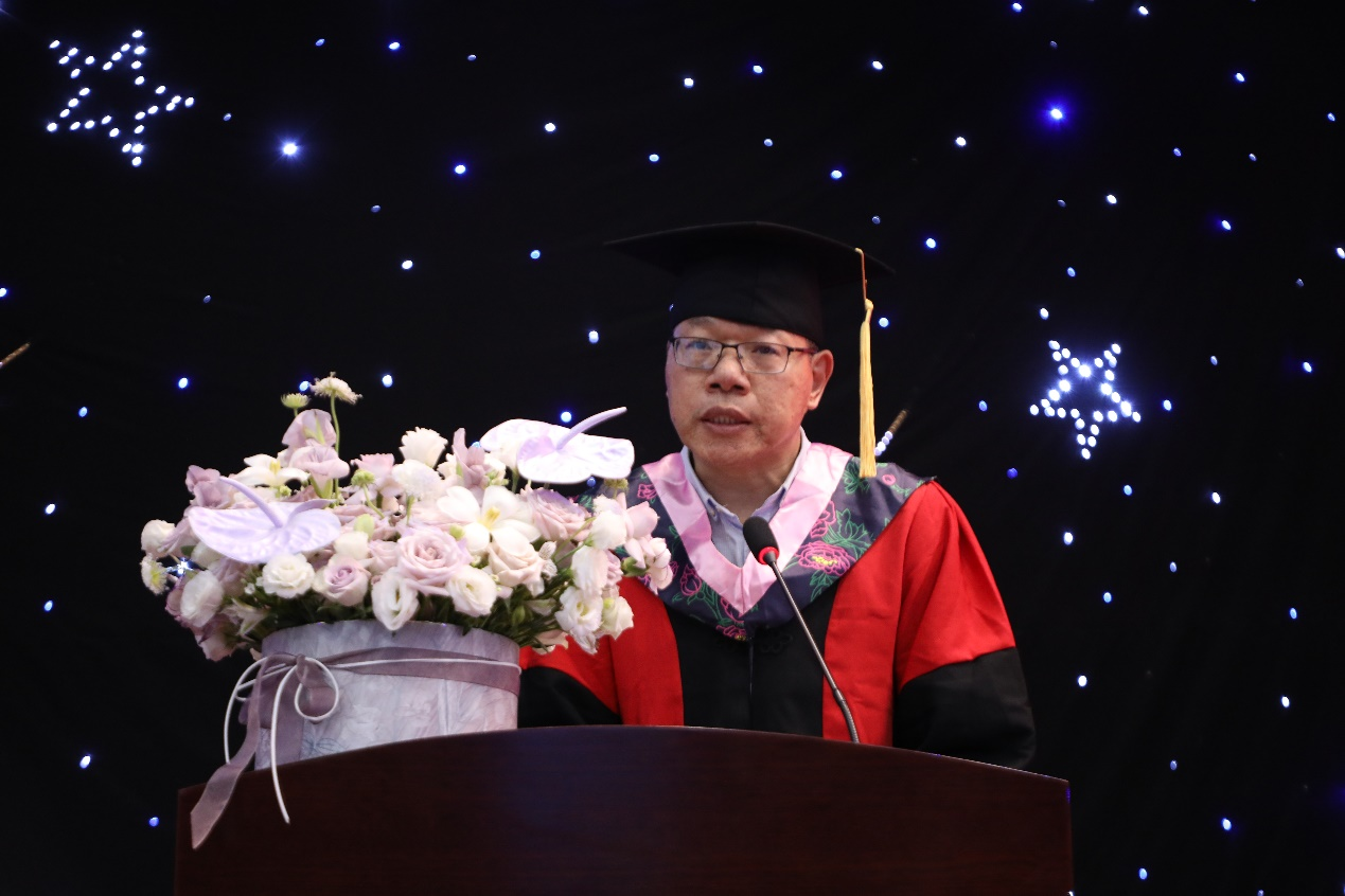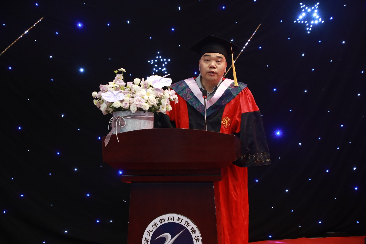 广播电视编导系主任高红波作为教师代表向毕业生致以诚挚的赠言。他鼓励毕业生向前走,别回头,希望毕业生们用一往无前的勇气,奔赴山海,保持热爱,用更好的姿态面向未来的工作学习和生活。