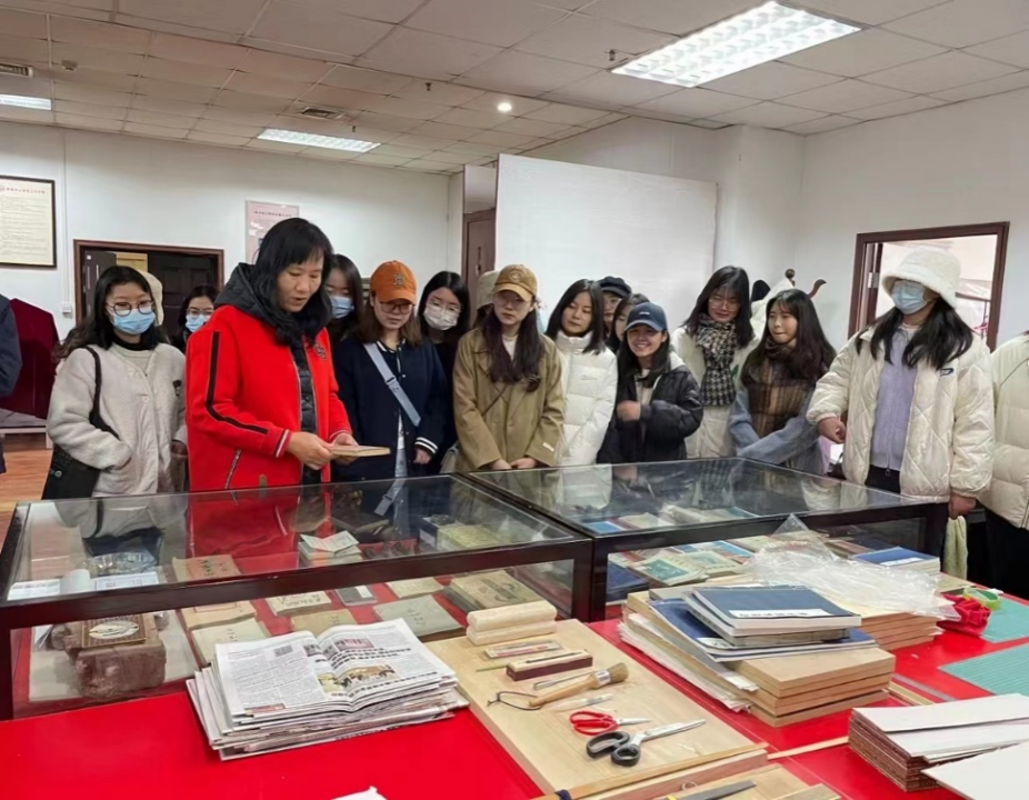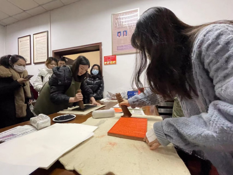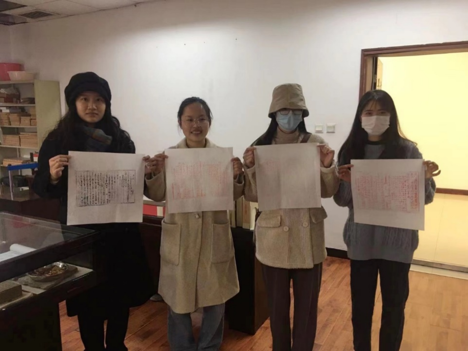 11月15日上午,在郭鸿昌老师的组织和带领下,公司2022级新闻传播学硕士研究生前往金明校区图书馆珍藏室和古籍修复中心进行参观学习。图书馆特藏部副主任张静老师以及宋璞、佟燕华、谢蕴、徐秀玲等老师热情接待了同学们,为大家进行详细讲解和答疑,并带领同学们进行了手工雕版印刷体验。