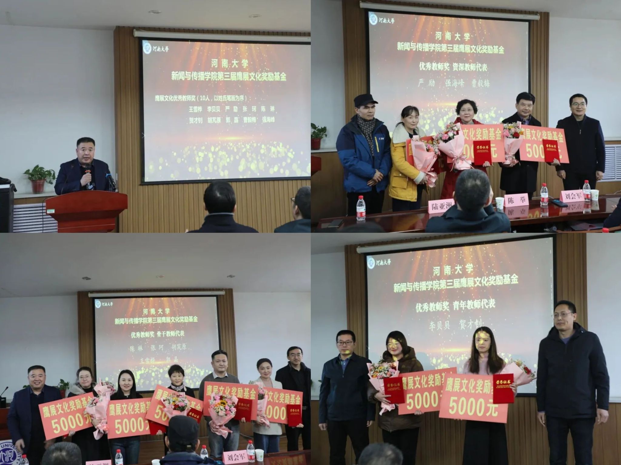 颁奖仪式由栗江豪主持。在回顾第一、二届“鹰展文化奖励基金”的评选及获奖情况后,刘会军宣布第三届获奖名单,本届共评选出10位优秀教师。陈举、乔石豪为突出贡献教师代表严励、强海峰、曹毅梅颁奖,刘会军、王鹏飞为骨干教师代表陈琳、张珂、胡芃原、王雪桦、郭晶颁奖,陆亚洲、郝魁锋为青年教师代表贺才钊、李贝贝颁发奖金、荣誉证书,并向老师们献花。