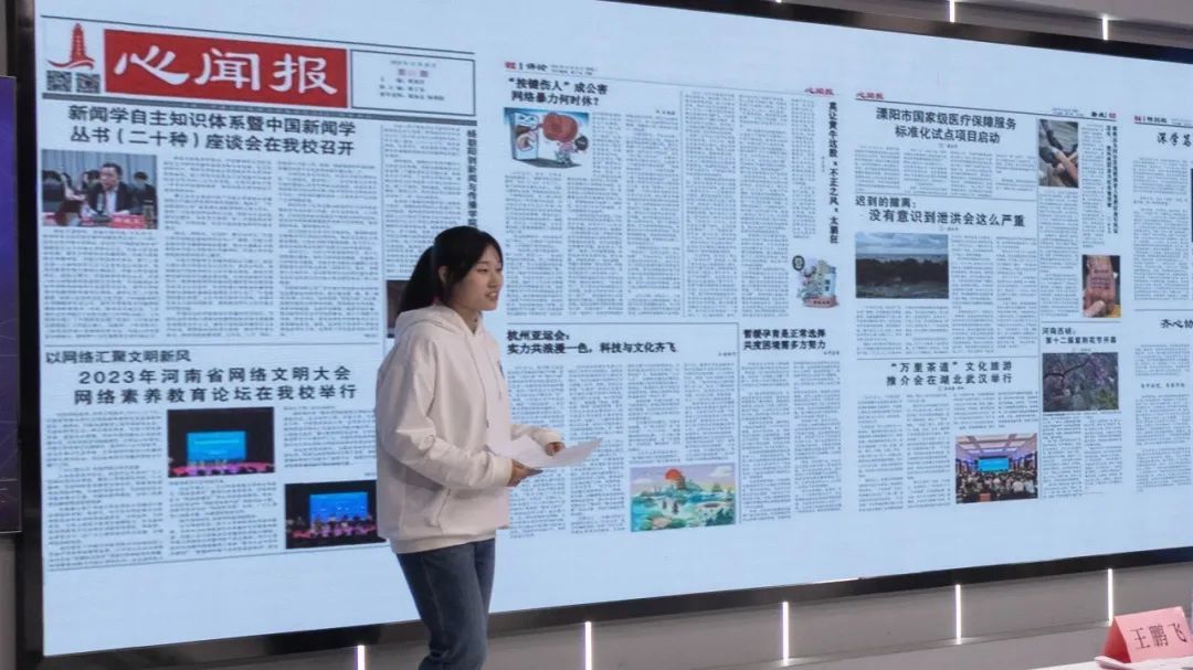 《心闻报》主编邢嘉欣介绍了报纸的编排思路和编辑理念。本届铁塔记者文化节《心闻报》在郭灿金、杨利娟等老师指导下,由2021级新闻班同学完成。报纸共分为八个版面,每个版面的主题各有侧重,展现了本校动态、新闻学界大事记以及学子对时政热点、社会百态的独特见解。