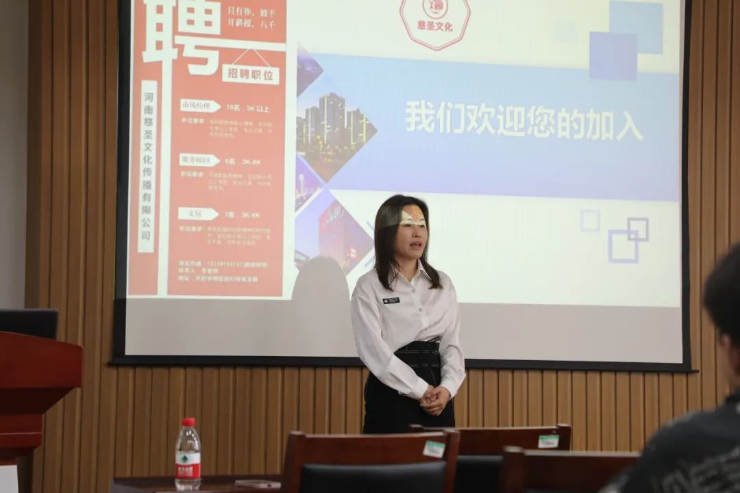 为更好地开展就业服务工作,助推公司学子积极就业。4月18日上午,河南盛世知识产权事务所有限公司负责人尹婉玲、河南慈圣文化传播有限公司负责人李汶麇莅临公司一楼东报告厅开展招聘宣讲。