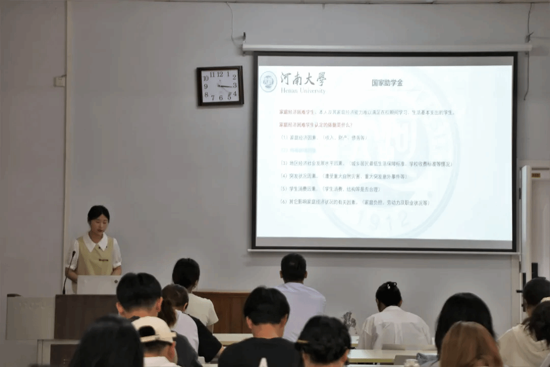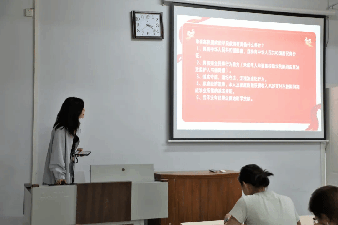 2023级生活委员郎筱淇围绕高校助学贷款、生源地助学贷款两部分,讲解了国家助学贷款政策的申请资格、发放流程等内容。