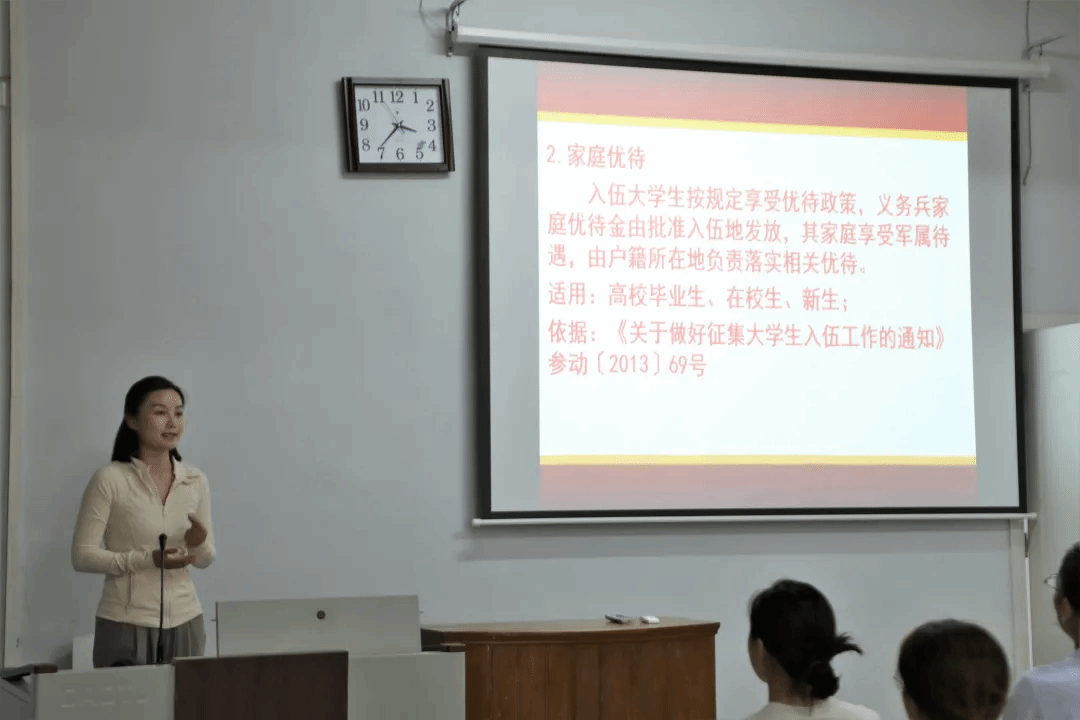 作为退伍士兵,2021级播音与主持艺术本科生李思琪向大家解读了应征入伍优惠政策,包括报名流程、体检要求和优惠政策等知识,鼓励大家积极参与。