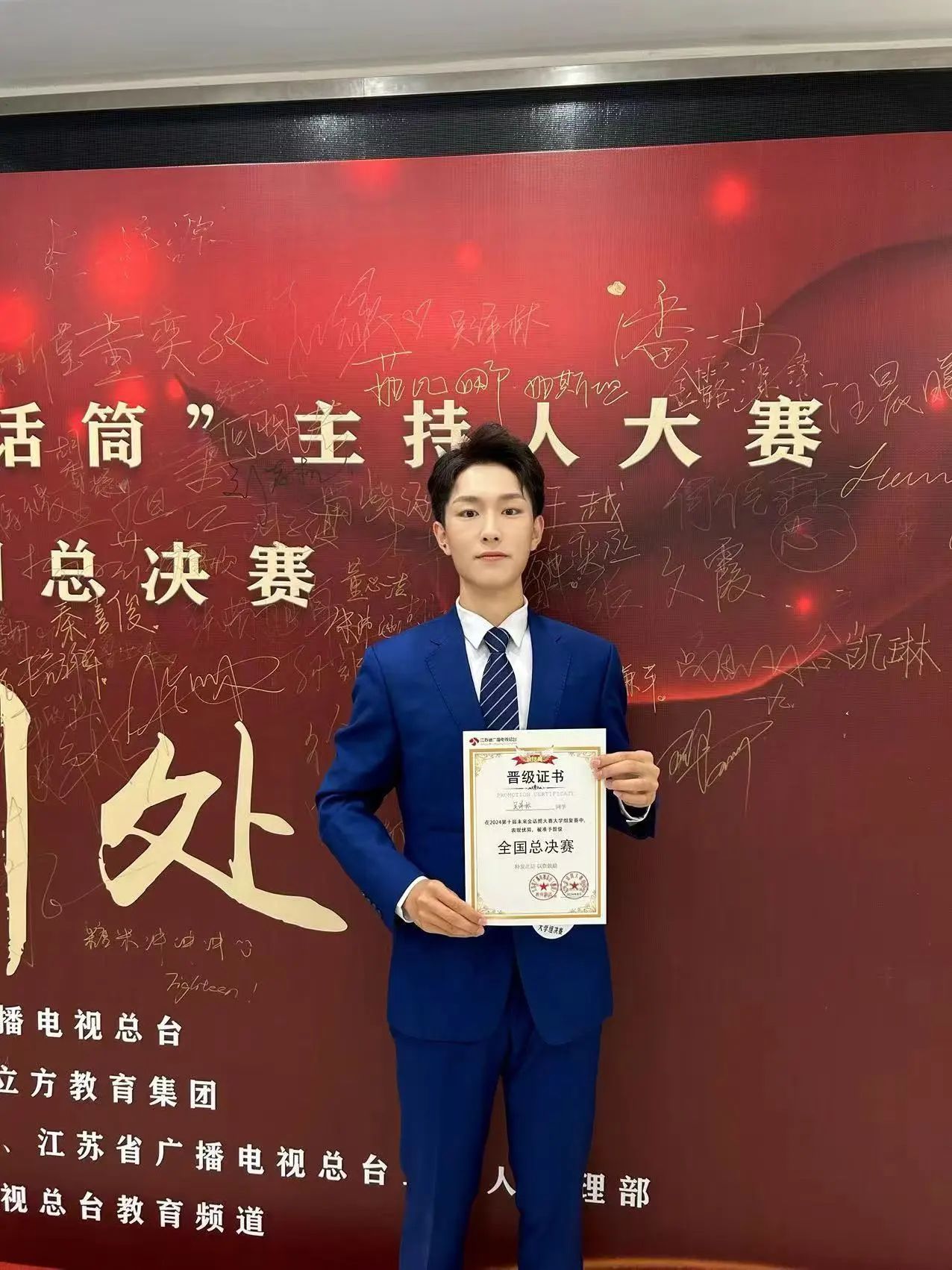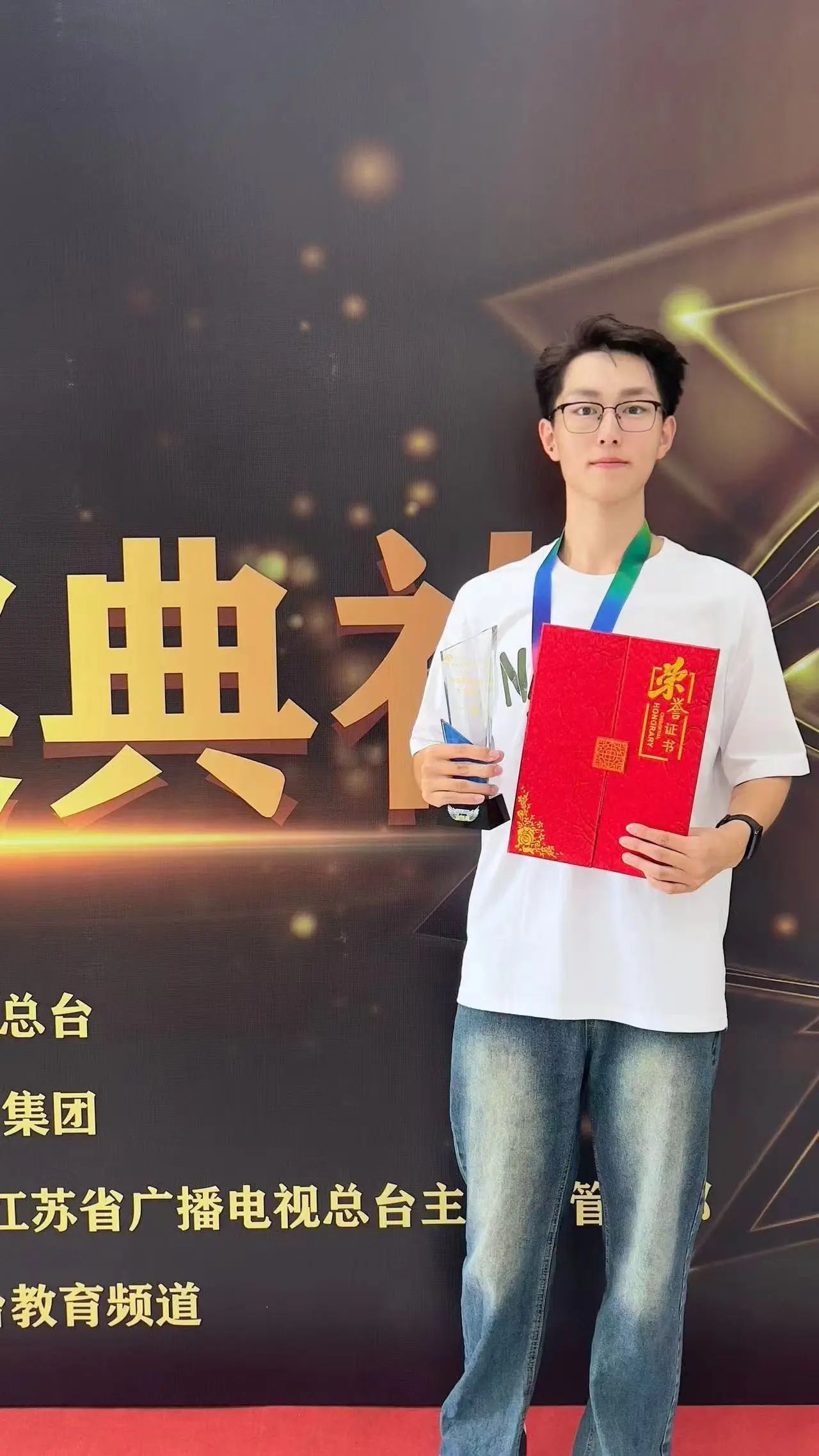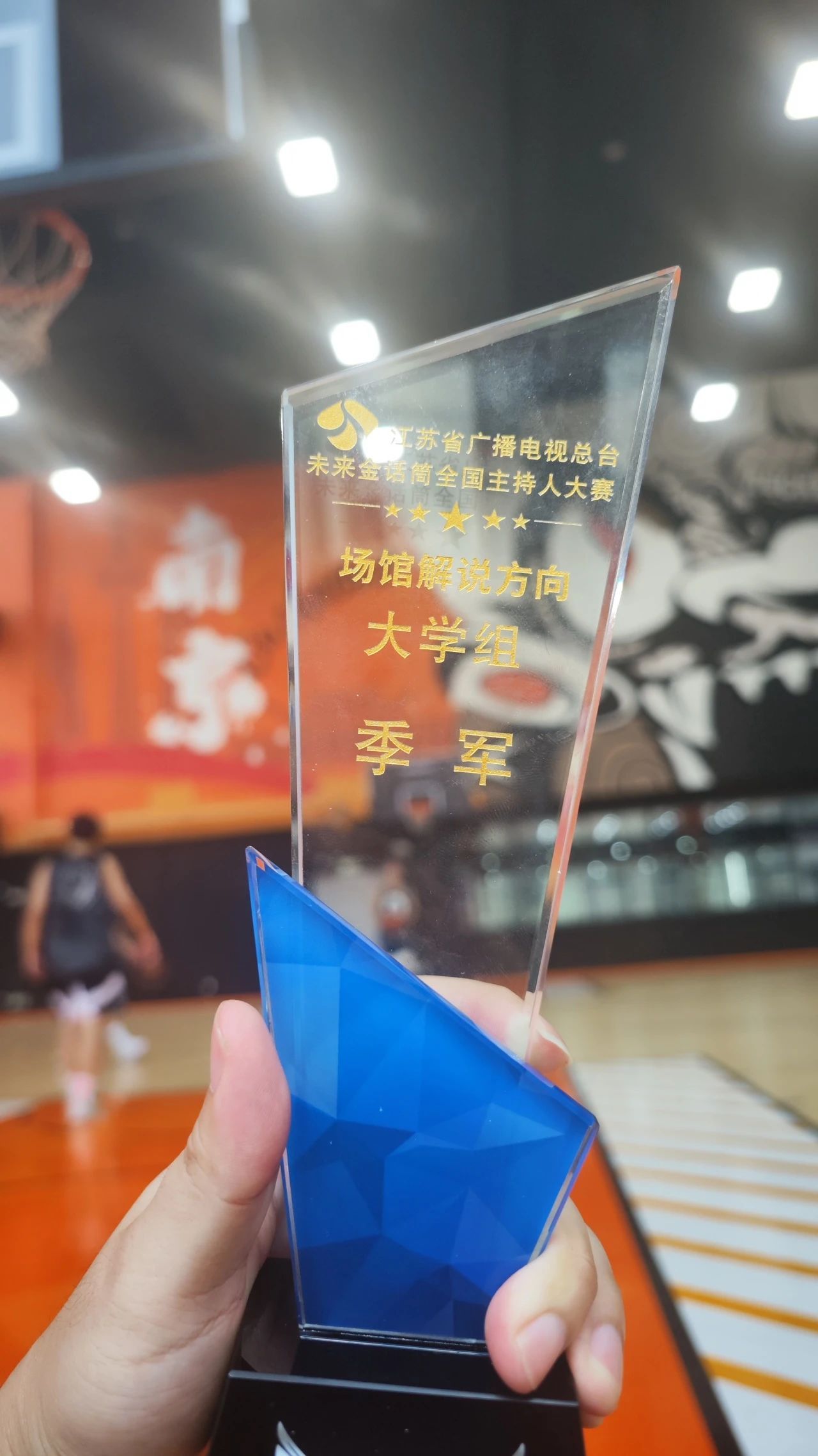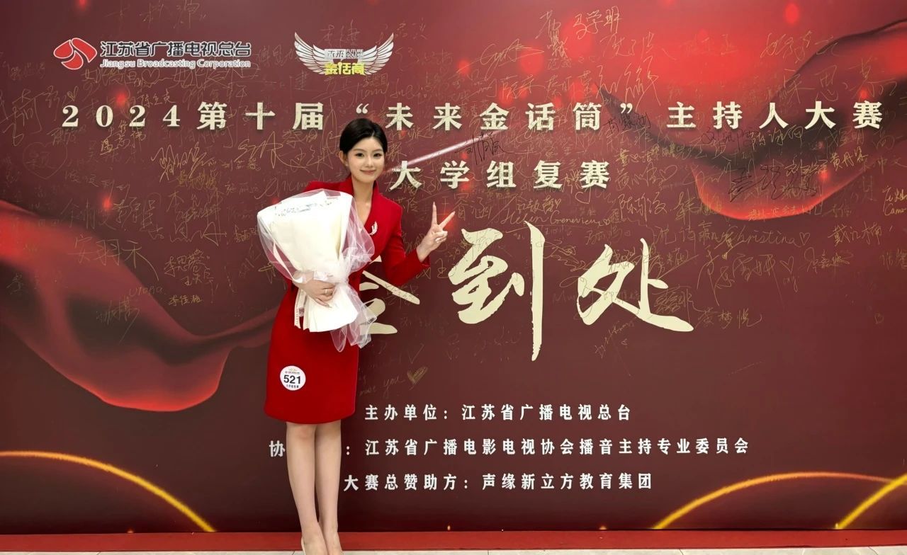 很荣幸在江苏广电金话筒主持人大赛中获奖。从初赛的紧张到决赛的风采展现,我不断磨砺表达和应变能力,期间的练习让我收获颇多。感谢大赛提供的平台,也感谢老师和同学的帮助。这个奖项是新起点,我会继续努力,用话筒传递美好与力量,在主持之路上不断探索,展现更多风采。