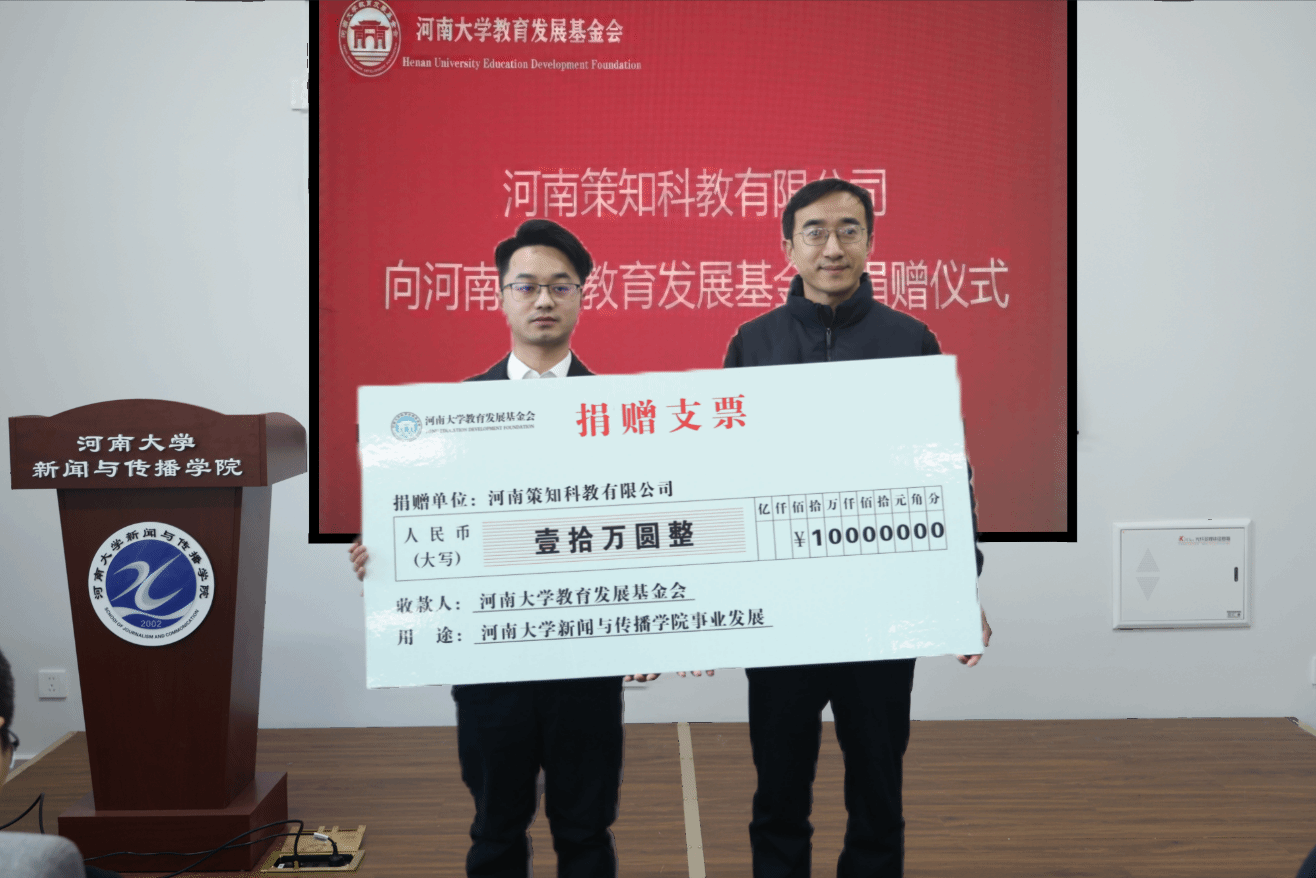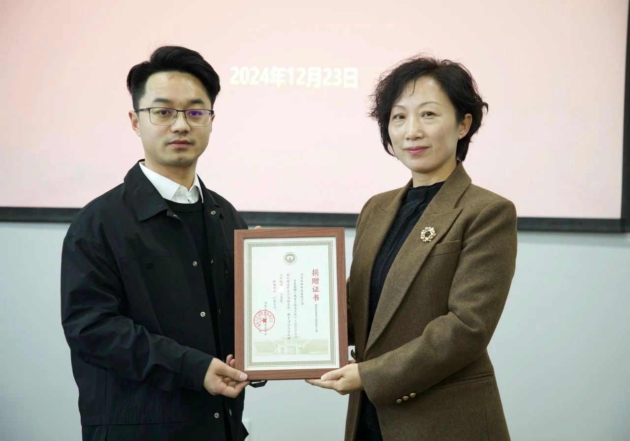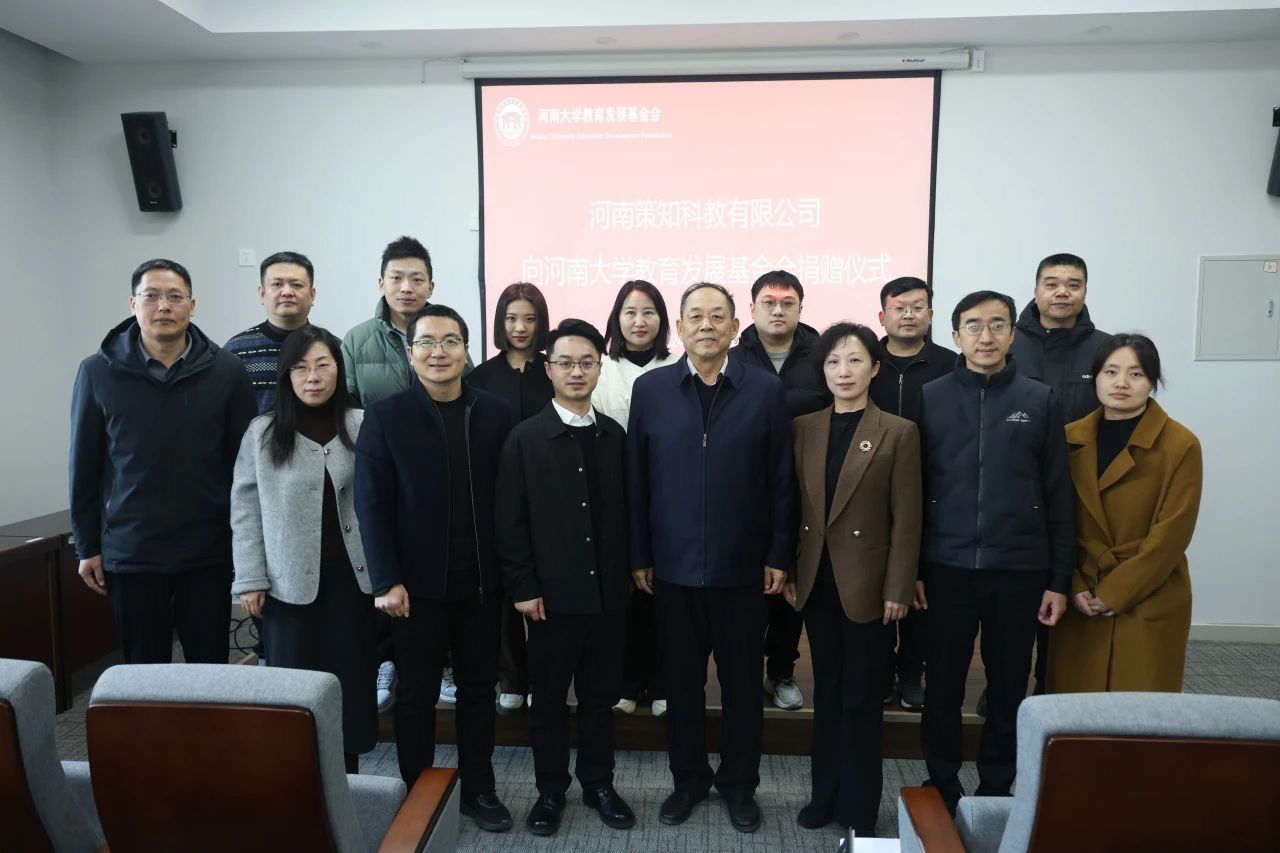 捐赠仪式上,王鹏飞代表公司接受捐赠,刘婷和乔石豪分别向河南策知科教有限公司副总经理刘棒颁发了捐赠证书及纪念杯。最后,参会人员合影留念。
