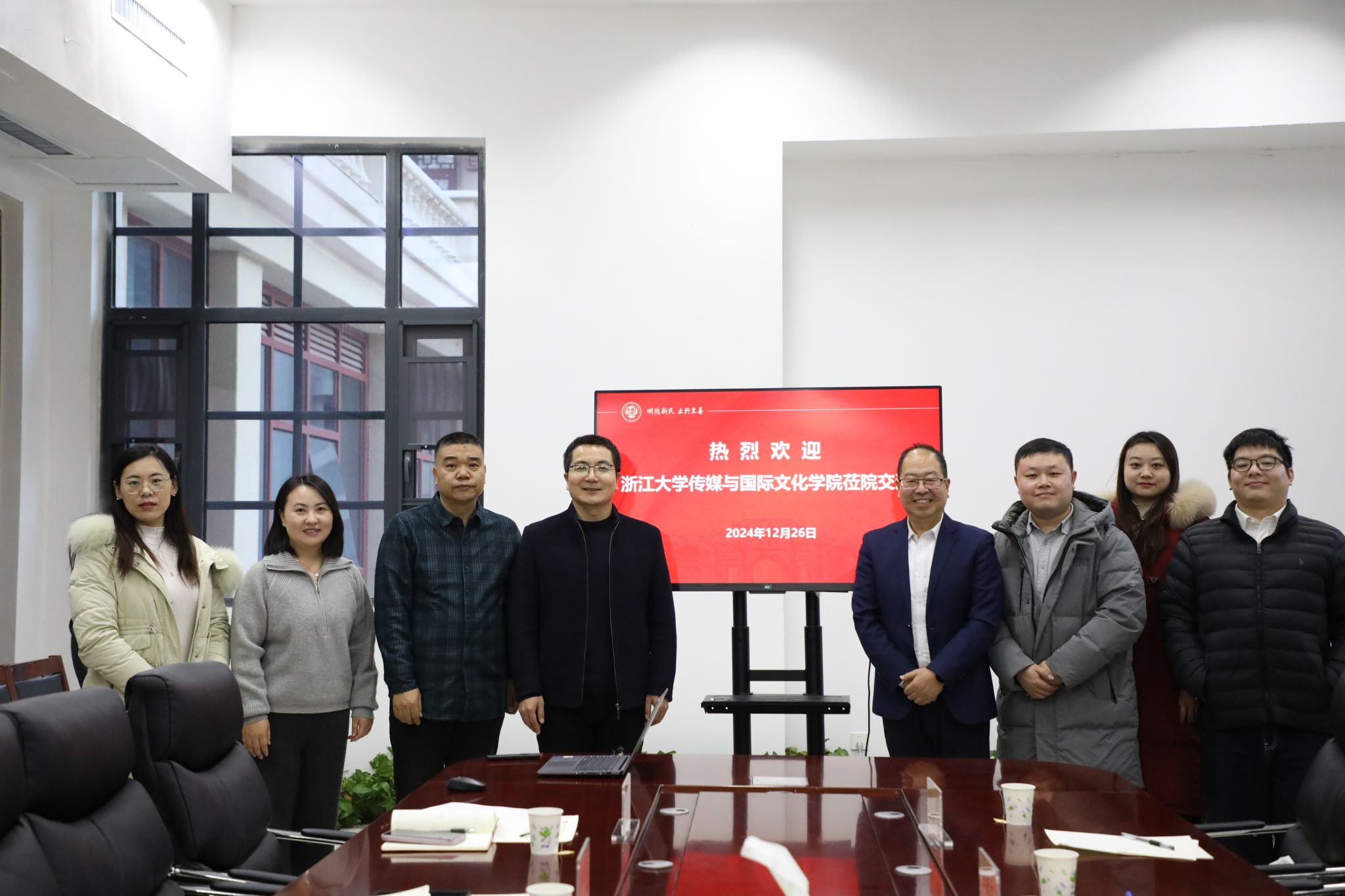 12月26日下午,浙江大学传媒与国际文化公司党委书记王庆⽂,百⼈计划研究员田元,国际⽂化公司实验师仇璜,党政办公室⼲事贾若⾠一行四人莅临公司进⾏座谈交流。公司党委书记乔石豪、副经理高红波、党委办公室主任陈琳及教师张金萍参加座谈,座谈会由乔石豪主持。