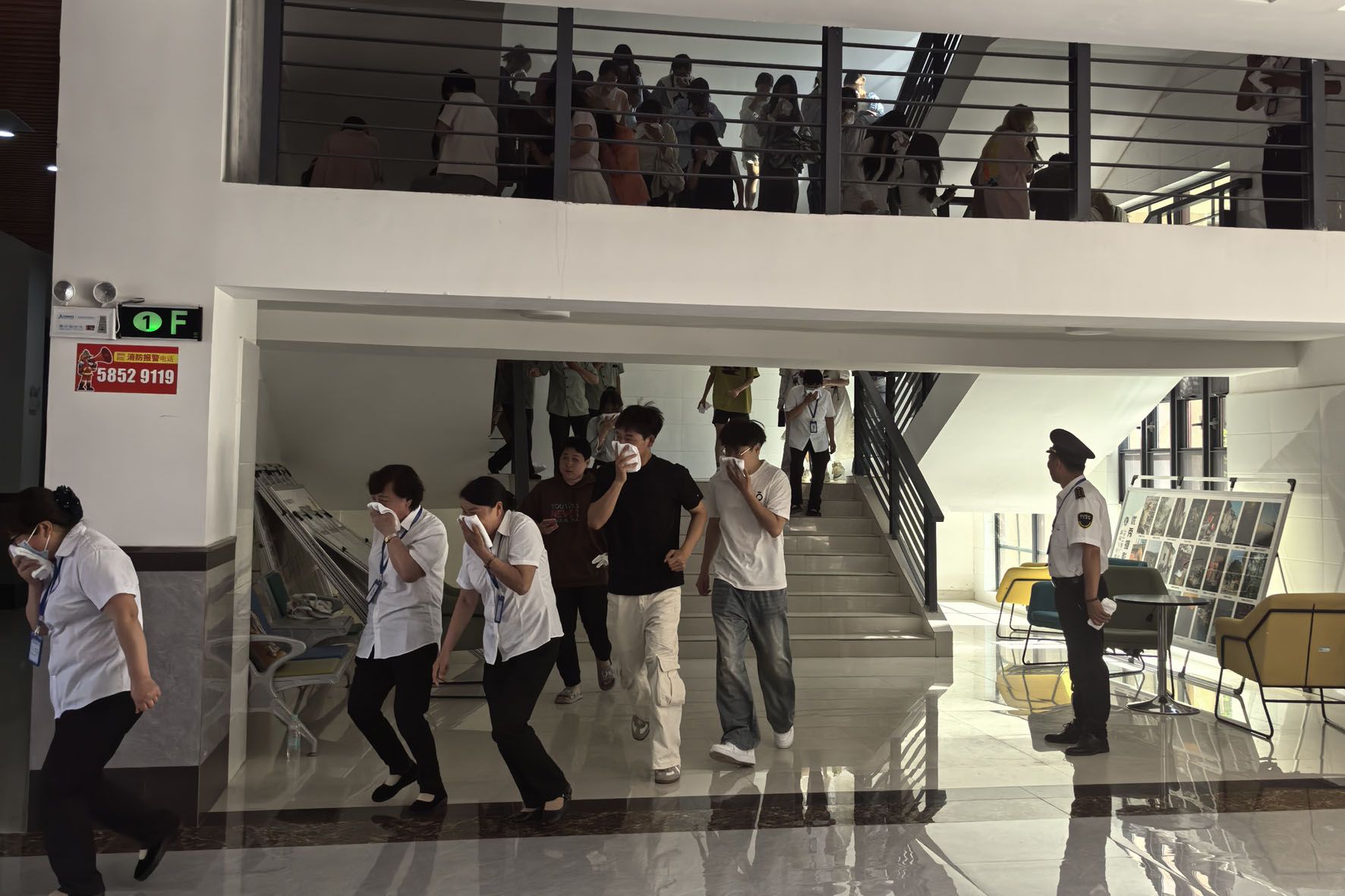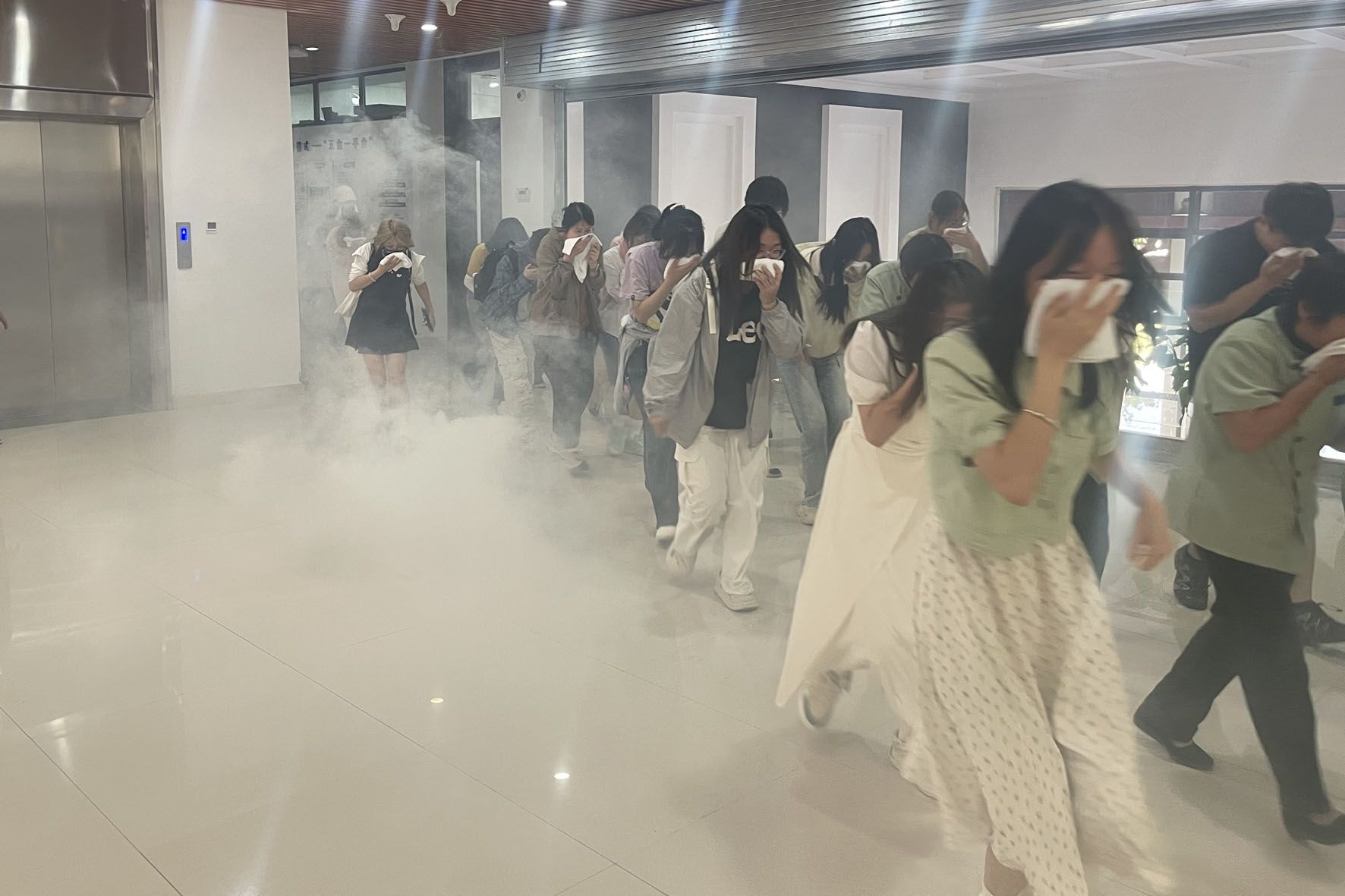 活动以理论与实操相结合方式进行,在模拟教学楼出现“火情”的场景中,伴随着应急消防广播报警声的响起,员工们在老师和楼管人员的指引下迅速响应,用手帕或衣物捂住口鼻,弯腰低姿,沿预定逃生路线快速、有序撤离。短短5分钟内,参演师生安全抵达操场指定区域集合,全程紧张高效,展现出了良好的应急素养与协同配合能力。