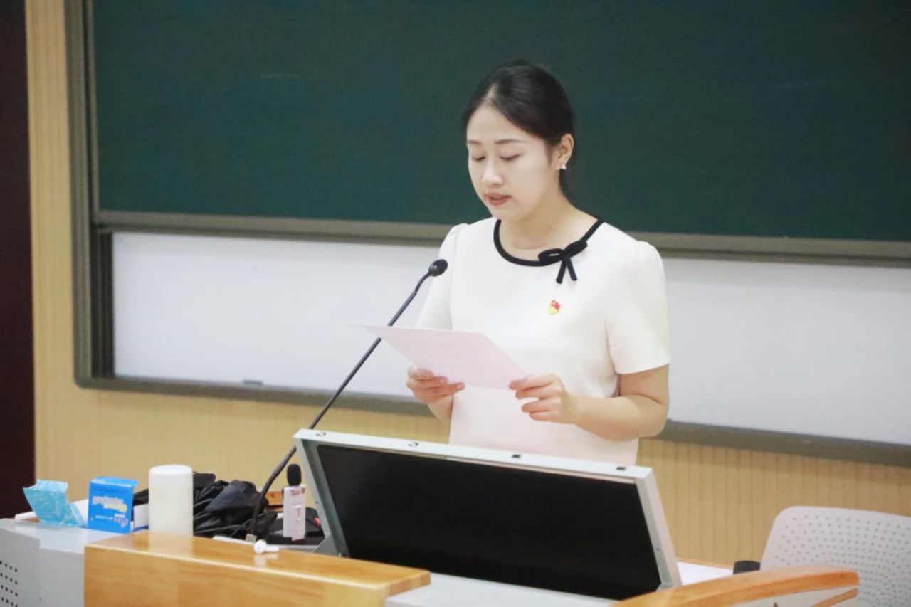 本科生第六党支部党员孟可馨作为毕业生代表上台发言。她分享了自己在党组织培养下的成长蜕变,表示将牢记母校与党组织的教诲,以党员标准严格要求自己,为党旗增光添彩。