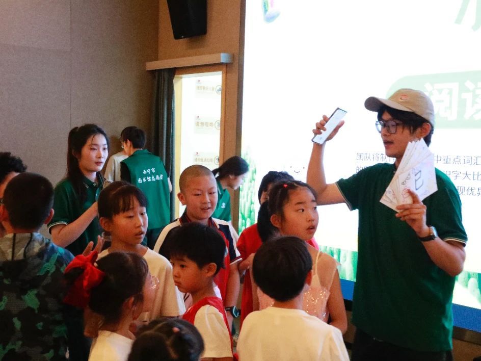 全民阅读推普课堂上,团队设计“绘本共读+情景对话”趣味课程。从基础声韵教学到“词语接龙”“龙大比拼”游戏,孩子们踊跃参与。一句“老师,我以后要当主持人!”的自信童言,彰显了语言力量托举乡村振兴的希望。