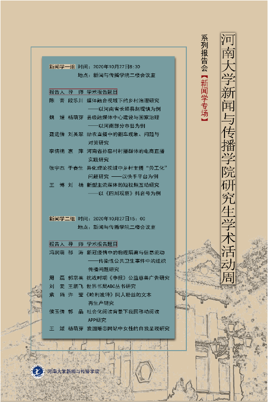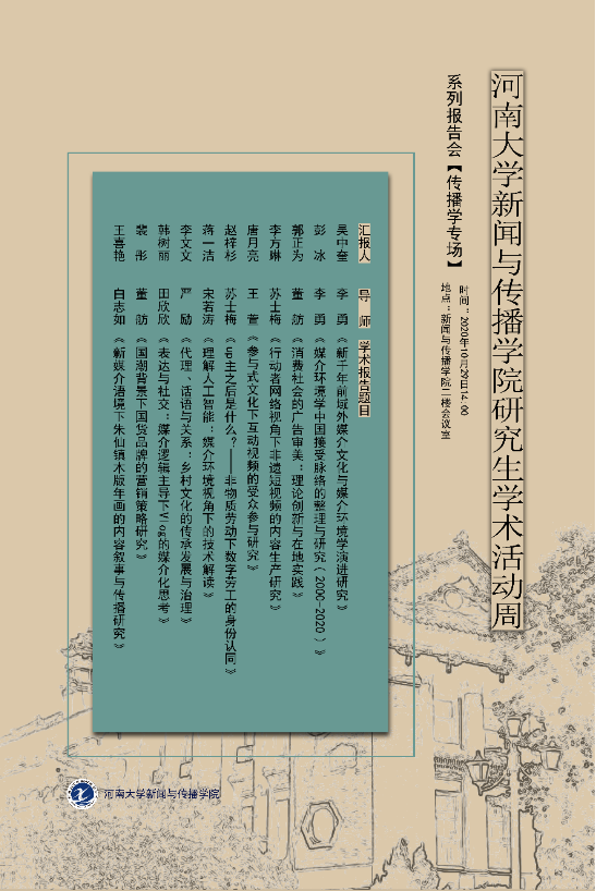 为进一步促进公司研究生的学术创新能力,营造积极向上的学术氛围,公司拟结合中期考核开展研究生学术活动周,组织2018级新闻传播学、戏剧与影视学专业研究生做专场主题学术报告。