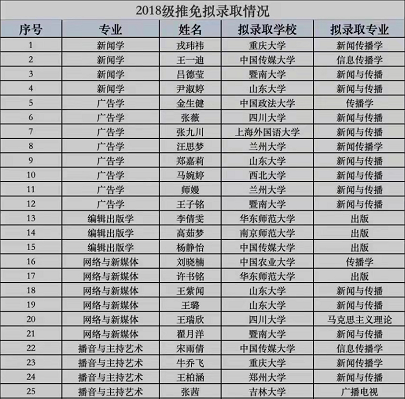 公司2018级本科生共有34名同学成功推免硕士研究生。他们以优异的成绩被山东大学、四川大学、华东师范大学、重庆大学、兰州大学、中国农业大学、中国传媒公司、暨南大学等知名高校录取。