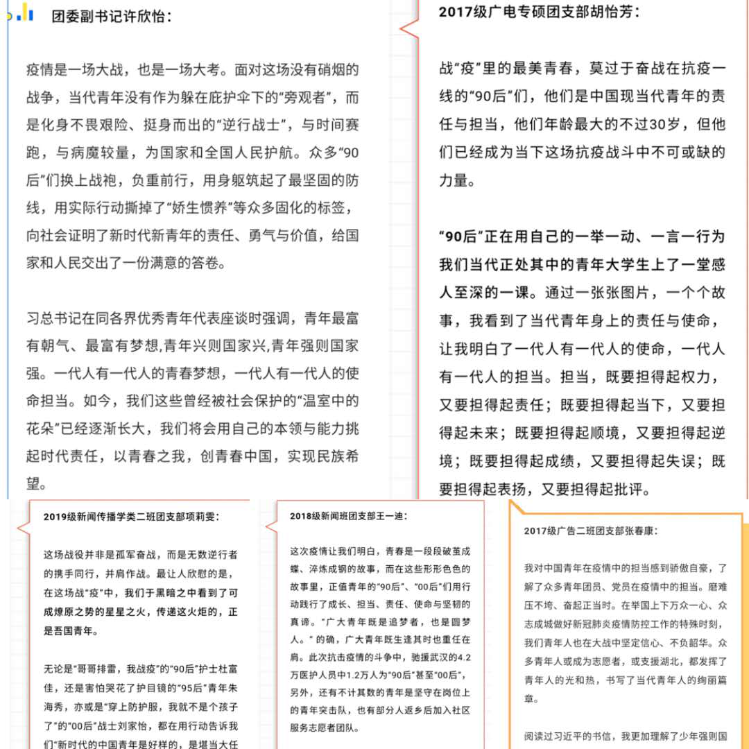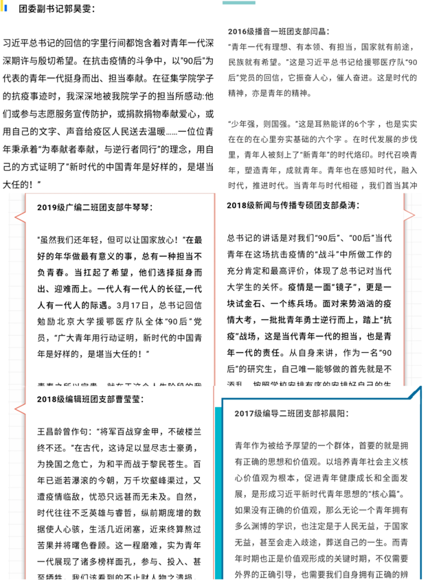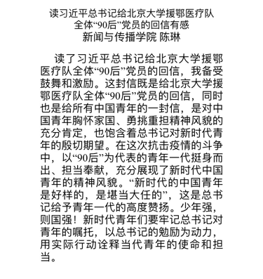 3月15日,中共中央总书记、国家主席、中央军委主席习近平给北京大学援鄂医疗队全体“90后”党员回信,向他们和奋斗在疫情防控各条战线上的广大青年致以诚挚的问候。习近平总书记的回信在公司引发了热烈的反响,公司员工有感而发,纷纷用文字表达对祖国和青春的敬意。院团委共收到来自全院本科生、研究生各团支部的近50篇学习感悟,部分优秀学习感悟在院团委官方微信公众号进行了推送展示。