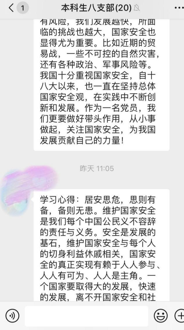 本科生四支部2018级预备党员翟星洋说:“一个安全的国家是人民幸福生活的前提条件。维护国家安全人人有责,作为老员工的我们要认真学习《国家安全法》,增强国家忧患意识、国家安全意识,积极承担起维护国家安全的责任!”