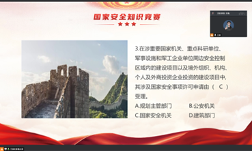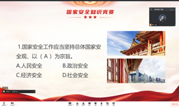 各年级自行组织开展“国家安全教育”知识竞赛活动,围绕“国家安全知识”的主题,设置了选择题、填空题、标识竞猜等丰富题型,让同学们在互动竞赛中学习国家安全知识,提高同学们的国家安全意识。