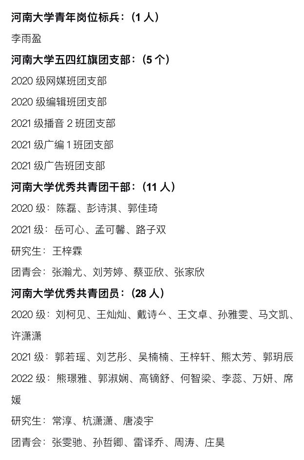 未来属于青年,希望寄予青年。正如本次五四表彰大会上,公司2020级播音与主持艺术专业张瀚尤的发言:“作为新时代青年,我们应当把个人奋斗融入实现国家富强、人民幸福的事业中,在五四精神的指引下,以实现中华民族伟大复兴为己任,激荡河大青年的青春能动力和创造力,在时代大潮中做一朵奔腾的‘后浪’,永远心怀梦想,永远充满力量,在担当中历练,在尽责中成长,在奋斗中绽放!”身处时代洪流中的你我应积极向上,力担重任,以青春之底色,绘青年之雄姿!