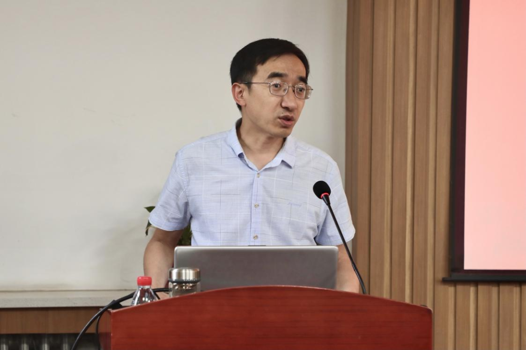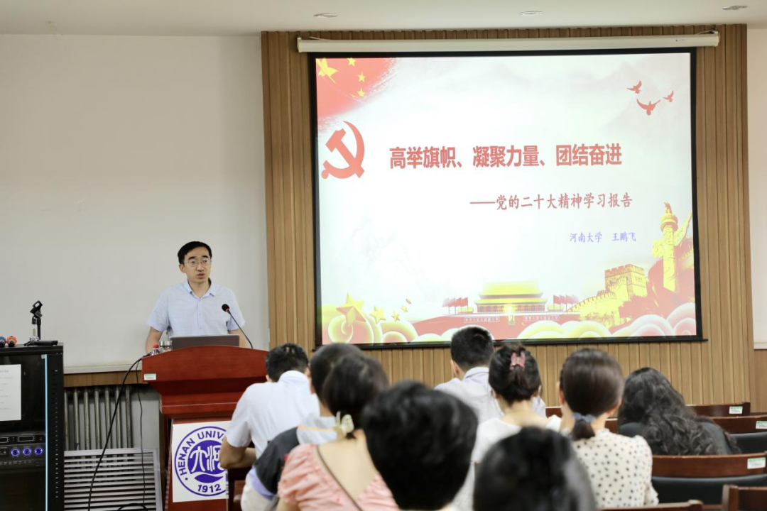 随后,王鹏飞带领全体参会人员学习党的二十大精神。他首先带领参会人员回顾党的二十大的各项流程并解释会议主题所回应的时代问题。接着,他从党和国家事业的重大成就、马克思主义的中国化时代化、新时代中国共产党的使命和任务、新发展格局的构建以及新时代的工作思路与重点五个方面对党的二十大报告进行解读。