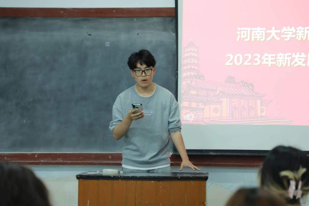 2022级播音与主持艺术专业的张森代表新团员发言。他号召新团员要勇挑重担,努力干好本职工作,并不断审视自我,坚守初心与使命,继承发扬共青团的优良传统,以团员的标准严格要求自己,发挥模范带头作用。“热爱团组织,坚定共产主义信仰。努力使自己成为一个高尚的人,成为一名优秀的共青团员。”