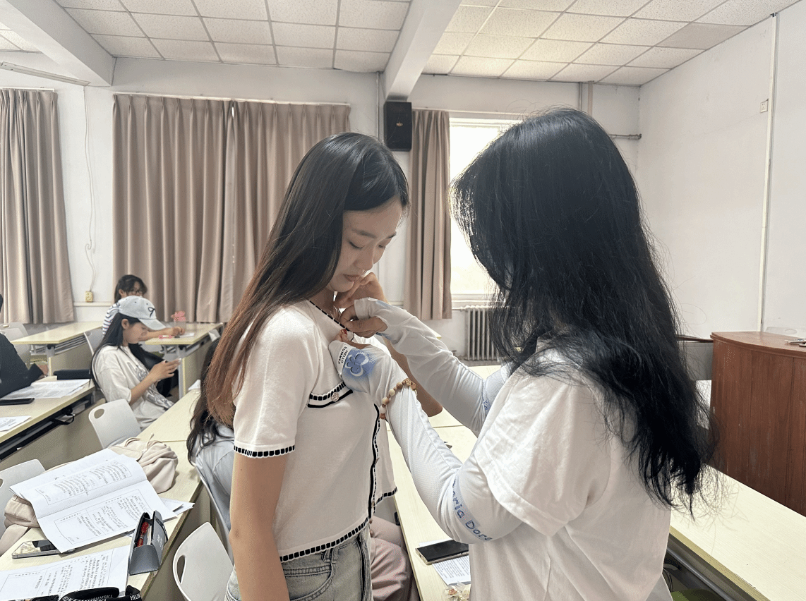 随后,于含雨作为老团员代表为各位新团员佩戴了团徽。佩戴团徽不仅意味着正式成为一名光荣的共青团员,更代表着要肩负起作为团员的使命责任,继续发扬中国共产主义青年团的优良传统。