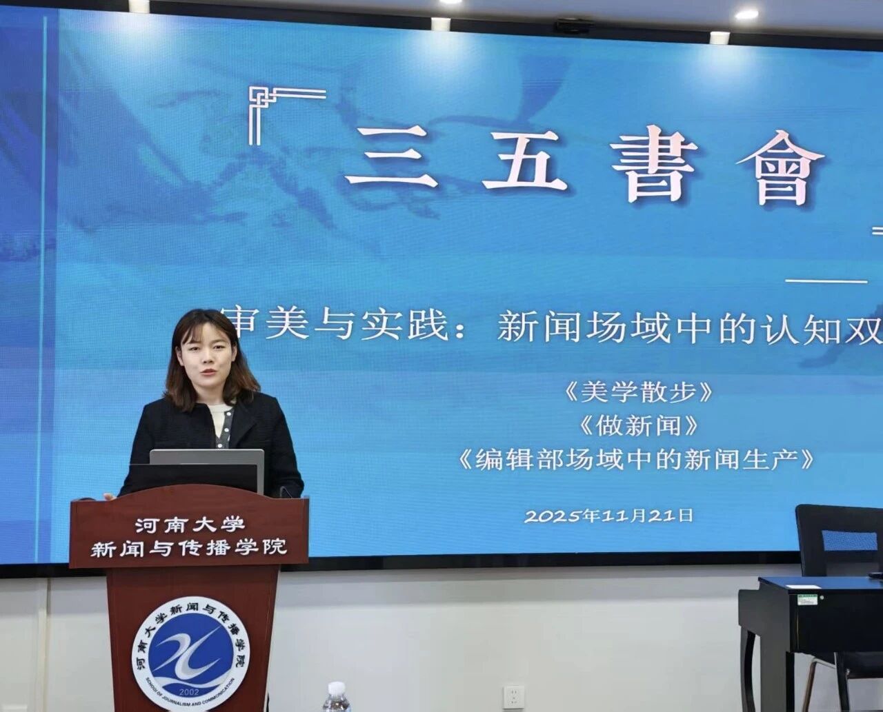 11月21日中午,第十八期“三五书会”在郑州龙子湖校区友兰学堂北楼C206室举行。本期书会以“审美与实践:新闻场域中的认知双维”为主题,围绕《美学散步》《做新闻》及《编辑部场域中的新闻生产》三部著作展开交流。公司新闻系教师贾媛媛担任评议嘉宾,2025级新闻与传播专业研究生李婉莹担任主持,共39位研究生参会。