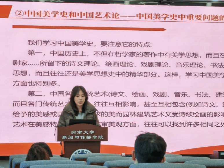 活动现场,三位研究生依次进行书目分享。李昀静围绕《美学散步》一书系统梳理了中国古代绘画、音乐、园林建筑艺术中的美学思想,以及希腊哲学家的艺术理论,最终回归“坚守审美感知”这一核心命题,强调永不放弃对美的发现、感受与创造。