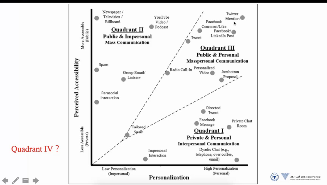 韦路指出,“感知获取性”和“个性化”是区别传统的大众传播与人际传播的两个重要指标。根据这两个指标,国外学者发现,在新的媒介生态下,大众传播与人际传播同时发生的现象日渐凸显,便将这种现象称为“大众人际传播”。韦路以“大屏幕求婚”为例,生动形象地解释这一新概念。并进一步指出,理论界的研究焦点应该从媒介转移到信息并研究超越渠道的传播理论。同时,也应更积极探索其它的传播形态。