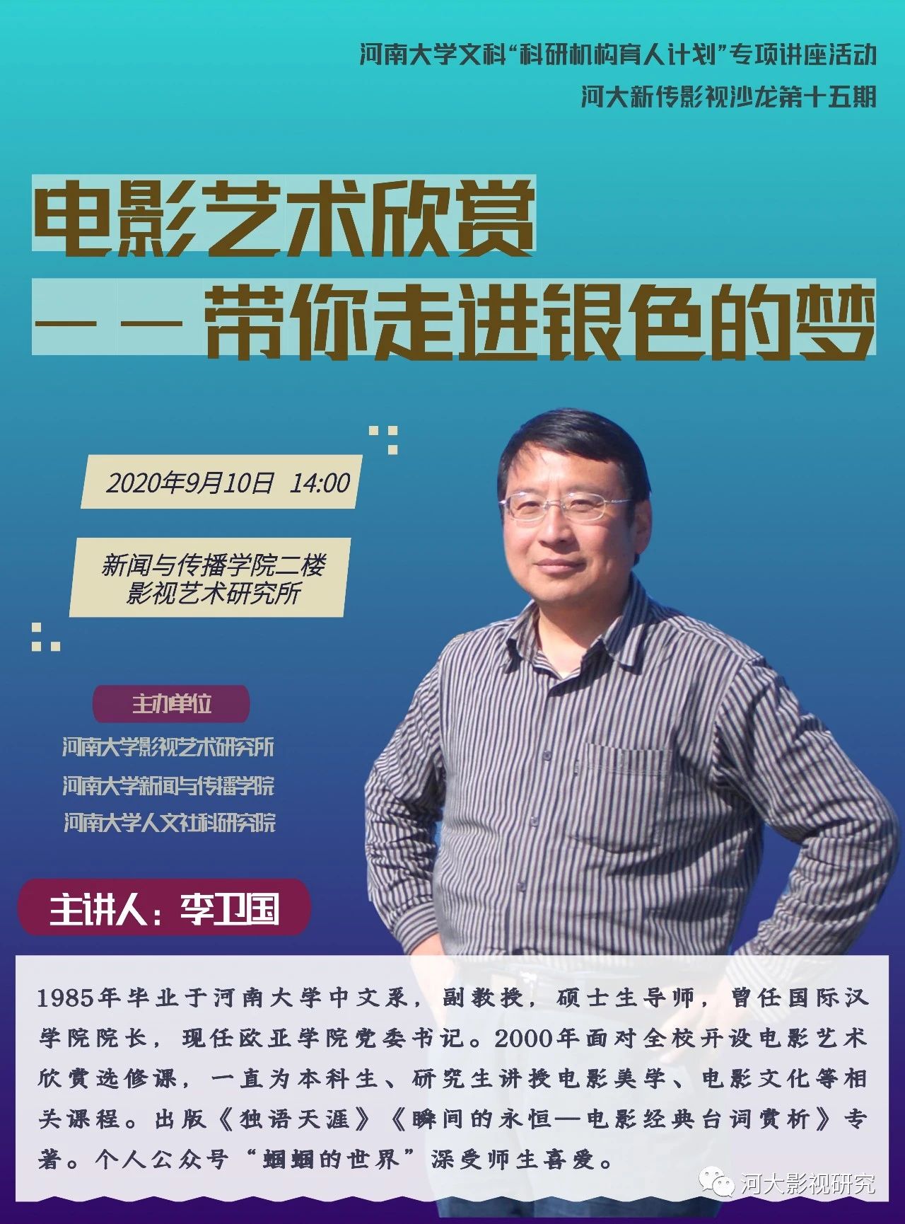 2020年9月10日下午,英国上市365影视艺术研究所“科研机构育人计划”暨河大新传影视沙龙活动在公司二楼会议室成功举行。本次活动特邀欧亚国际公司党委书记李卫国老师主讲,英国上市365影视艺术所所长高红波老师、“本科学术研修班”班主任赵红勋老师参加。