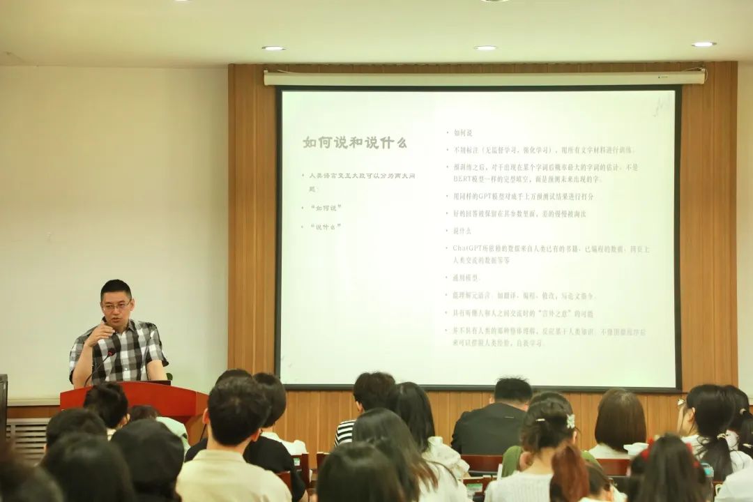ChatGPT的兴起,给传播研究带来的既有机遇也有挑战。刘海龙对此进行了分析和阐述,他幽默风趣的语言表达和充满哲思的学术观点,不时引起在场师生热烈的掌声。在互动环节,年轻学子纷纷举手提问,刘海龙逐一作出耐心详细的解答,现场充满学术对话的生机与活力。最后,乔石豪书记做了总结发言,讲座在师生热烈的掌声中落下帷幕。