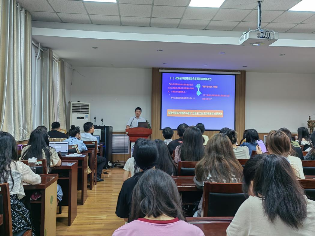 9月11日上午,明德·新传讲坛系列报告第23期在公司一楼东报告厅开讲。中国社会科公司新媒体研究中心秘书长、中国社会科公司大学新闻传播公司副经理黄楚新教授开展“以深度融合推进全媒体传播体系建设”主题讲座。公司副经理于春生、副教授祁涛出席此次讲座,新闻与传播专业部分研究生到场聆听。讲座由于春生主持。