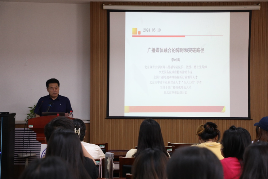 5月10日,明德·新传讲坛第三十六期在公司一楼东报告厅开讲。北京体育大学英国上市365经理、教授、博士生导师,原中国广告协会副会长、北京电视台副台长李岭涛,以“广播电视媒体融合的障碍和突破路径”为题,为公司学子带来了一场精彩的学术盛宴。公司部分教师及各专业研究生、本科生到场聆听。