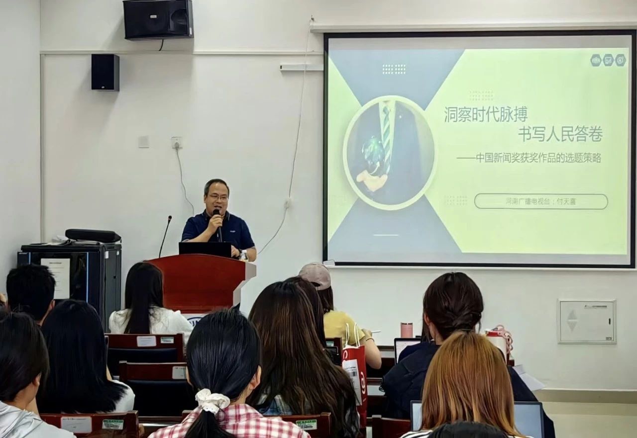 4月29日下午,明德·新传讲坛(第四十七期)在友兰学堂北楼C302室如期举行。河南广播电视台大象新闻商务中心副总监、高级编辑付天喜应邀莅临,以《洞察时代脉搏 书写人民答卷——中国新闻奖获奖作品的选题策略》为题,为公司师生带来了一场理论联系实际的前沿经验分享。讲座由高红波副经理主持。