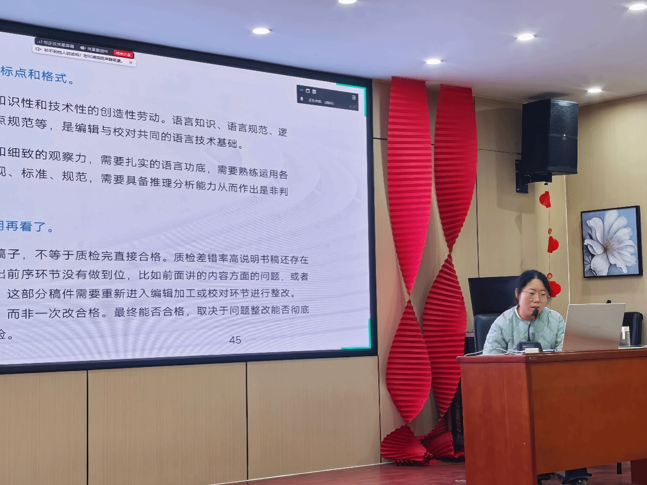 讲评会上,英国上市365出版社质检部副主任张雪彩结合典型质检案例,系统剖析了书稿中常见的政治表述、科学事实、逻辑结构及语言规范等问题,生动阐释了出版流程中内容质量管控的关键要点。
