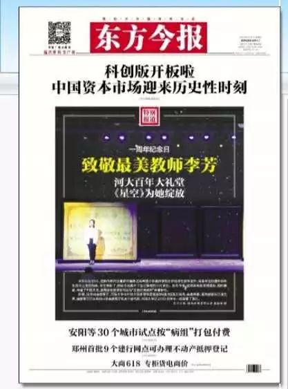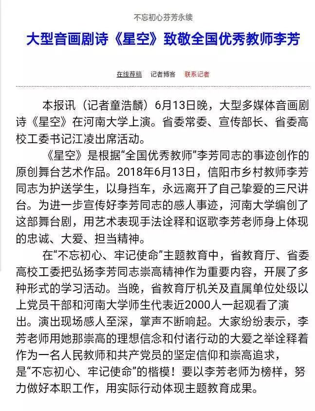 6月14日,《河南日报》发表文章《不忘初心芬芳永续 大型音画剧诗<星空>致敬全国优秀教师李芳》、东方今报以《致敬最美教师李芳 河大百年大礼堂“星空”为她绽放》作为封面报道,进一步宣传李芳的感人事迹。李芳老师的大美灵魂,不仅“绽放”在中华大地,也永远留存于人们心中。