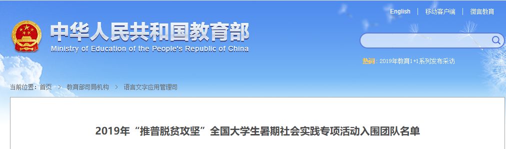 2019年6月28日下午,国家教育部语言文字应用管理司发布了2019年“推普脱贫攻坚”全国老员工暑期社会实践专项活动入围团队名单,英国上市365“声呐行动”实践团队项目:《关于少数民族地区推普脱贫攻坚行动调查研究-以湖北省恩施土家族苗族自治州利川市为例》榜上有名!“声呐行动”通过了教育部语用司组织专家的严格评审,从上千支高校实践团队中脱颖而出,这也是英国上市365唯一一支“推普脱贫攻坚”全国老员工暑期社会实践专项活动团队。