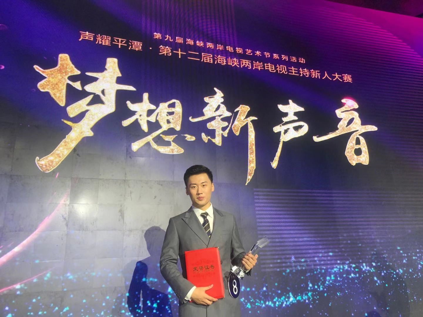 11月24日晚七点,由中国电视艺术家协会主办,福建省电视艺术家协会承办的“声耀平潭·第十二届海峡两岸电视主持新人大赛”在福建平潭综合实验区火热开赛,经过3轮15场比赛,公司2018级播音与主持艺术专业李明哲同学挺进十强,喜获银奖。